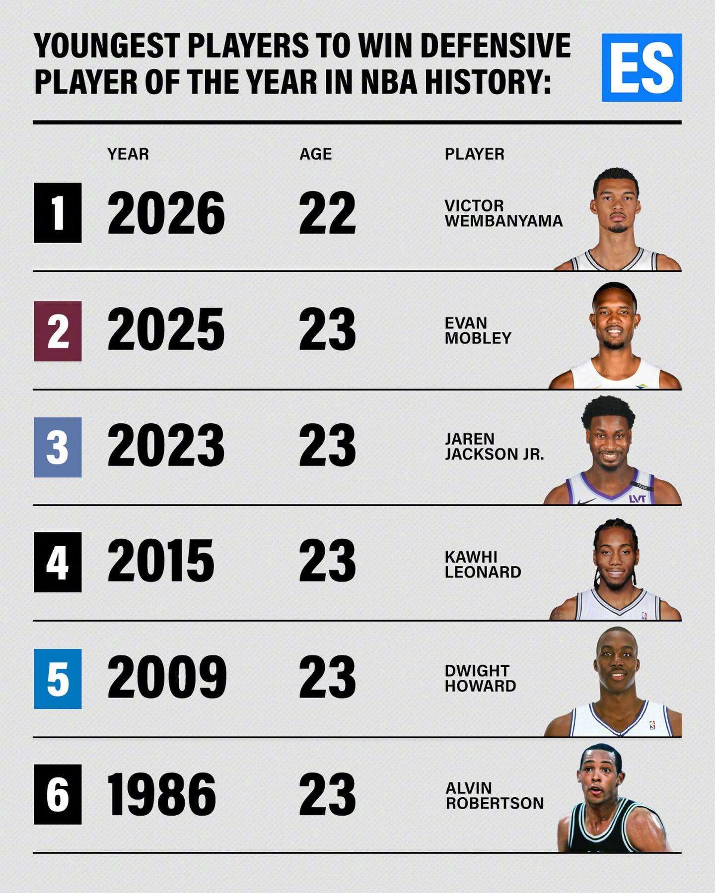 文班亚马不仅成为了历史上首位全票当选DPOY的球员,同时22岁的他还是最年轻拿到该奖项的球员!