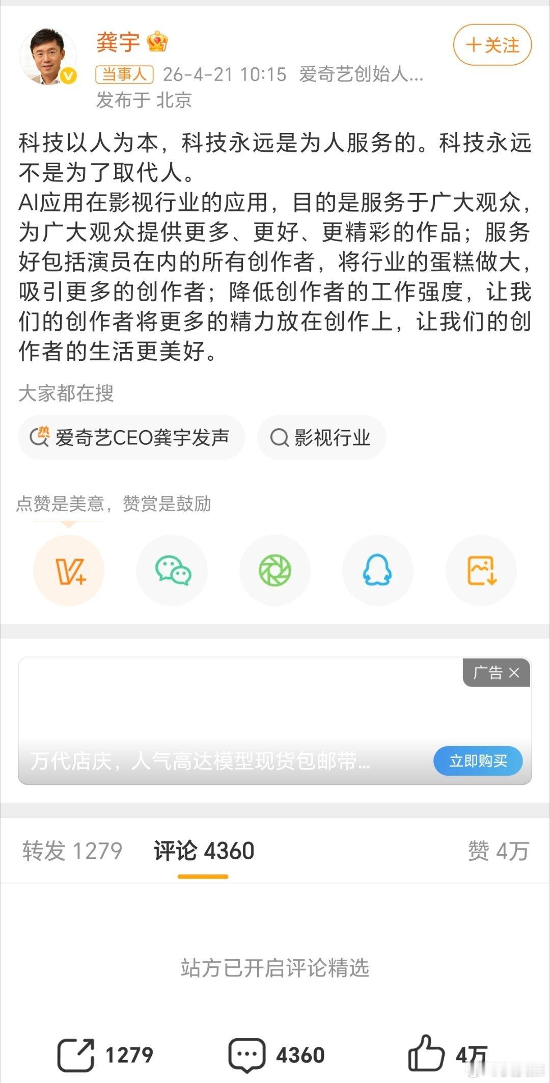 爱奇艺CEO龚宇发声爱奇艺CEO龚宇的微博已经开启站方评论精选。。。