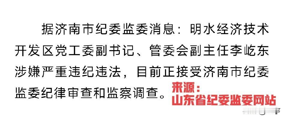 任职章丘36年,履历藏9个月空白期,国家级经开区二把手李屹东被查 2026年4月21日11时13分,济南市纪委监委发布权威通报。 明水经济技术开发区党工委副书记、管委会副主任李屹东涉嫌严重违纪违法。 目前正接受济南市纪委监委纪律审查和监察调查。 前一天,4月20日15时26分。 山东省医疗保险事业中心主任王京波被查。 再往前6天,4月15日。 兰陵省级农业高新技术产业开发区党工委书记、管委会主任王志乾被查。 短短7天,山东连查三名正处级核心干部。 覆盖经济开发区、医保民生两大高风险领域。 李屹东1971年12月生,山东章丘人。 1990年7月参加工作,1994年10月入党。 山东省青年管理干部学院思想政治教育专业毕业,大学学历。 他的整个职业生涯,从未离开过章丘。 整整36年,从乡村中学教师起步。 最终成为济南市唯一国家级经开区的日常运营核心。 其完整履历如下: 1987.08--1990.07 山东省历城师范学校普师专业学习 1990.07--1992.07 章丘县相公庄镇中心中学任教 1992.07--1995.08 章丘市相公庄镇团委书记 1995.08--1995.12 章丘市政府办公室行政科科员 1995.12--2002.03 章丘市政府办公室行政科副科长 (其间:1994.09--1997.07 山东省青年管理干部学院专科经贸管理专业学习;1999.09--2001.07 山东省青年管理干部学院本科思想政治教育专业学习) 2002.03--2003.03 章丘市政府办公室秘书科科长 2003.03--2008.03 章丘市圣井镇(街道)党(工)委副书记 2008.03--2012.09 章丘市两泉三河五湖水系建设管委会综合部主任 2012.09--2014.09 章丘市政府食品安全工作办公室主任 2014.09--2015.06 另行安排工作 2015.06--2017.01 章丘市明水街道党工委副书记、办事处主任 2017.01--2017.02 济南市章丘区明水街道党工委副书记、办事处主任 2017.02--2020.10 济南市章丘区双山街道党工委书记 (正处级,确定正处级时间从2016年9月14日起计算) 2020.10--2023年上半年 济南市章丘区人民政府副区长 2023年上半年--2026年4月 明水经济技术开发区党工委副书记、管委会副主任 李屹东个案最引人注目的,就是这段9个月的履历空白。 2014年9月至2015年6月。 官方履历只写了"另行安排工作"六个字。 这在党政领导干部公开履历中非常少见。 任章丘区副区长期间,他分管生态环境、城管、交通、信访、司法、退役军人事务等多个领域。 2023年调任明水经开区党工委副书记、管委会副主任。 明水经开区是济南"东强"战略核心主阵地。 管辖面积154.13平方公里。 集聚36家世界500强投资企业、2200多家工业企业。 李屹东全面统筹招商引资、产业培育、企业服务等核心工作。 手握项目审批、土地出让、资金拨付等重大权力。 他曾多次带队赴全国各地招商考察。 公开场合反复强调要打造优质营商环境,当好企业"娘家人"。 2024年11月,他还表示要以"同心助企"为抓手,为企业提供全方位精准服务。 如今却因涉嫌严重违纪违法被查。 言行形成强烈反差。 李屹东与王京波、王志乾三人有着惊人共性。 都是正处级核心岗位主要负责人。 都是长期深耕各自领域的业务骨干。 都手握巨额资金和项目审批权。 都在公开场合反复强调廉洁自律。 最终都倒在了权力和利益面前。 王京波掌管全省数千万人的"看病钱""救命钱"。 王志乾执掌兰陵农高区全面工作。 李屹东是明水经开区日常运营第一责任人。 三人落马再次证明。 没有任何岗位是"保险箱"。 没有任何人能凌驾于纪法之上。 全面从严治党永远在路上。 反腐败斗争必须久久为功。 各级领导干部必须时刻牢记"自身正、自身硬、自身廉"的要求。 敬畏权力,慎用权力。 清代济南籍高官董讷《过明湖》有云:"将移万顷莲花水,尽洗十年宦海尘。" 愿泉城清风长拂,莲花永洁。