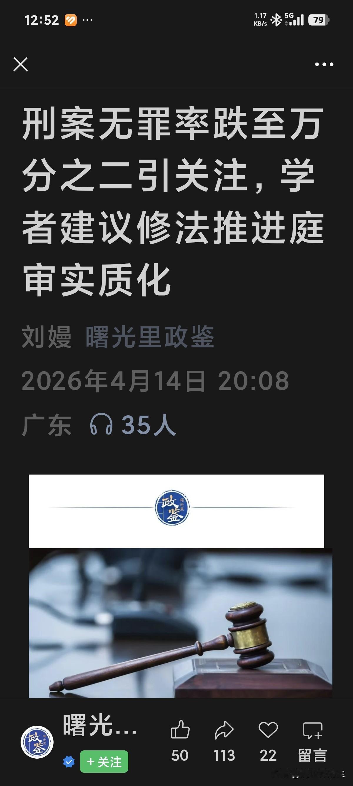 这篇文章值得看一下 刑案无罪率跌至万分之二,世界末位。什么意思,不便过多解释。 后面一句庭审实质化,也就是实打实的开展庭审及刑辩。 话不多说,还是自己搜了看。