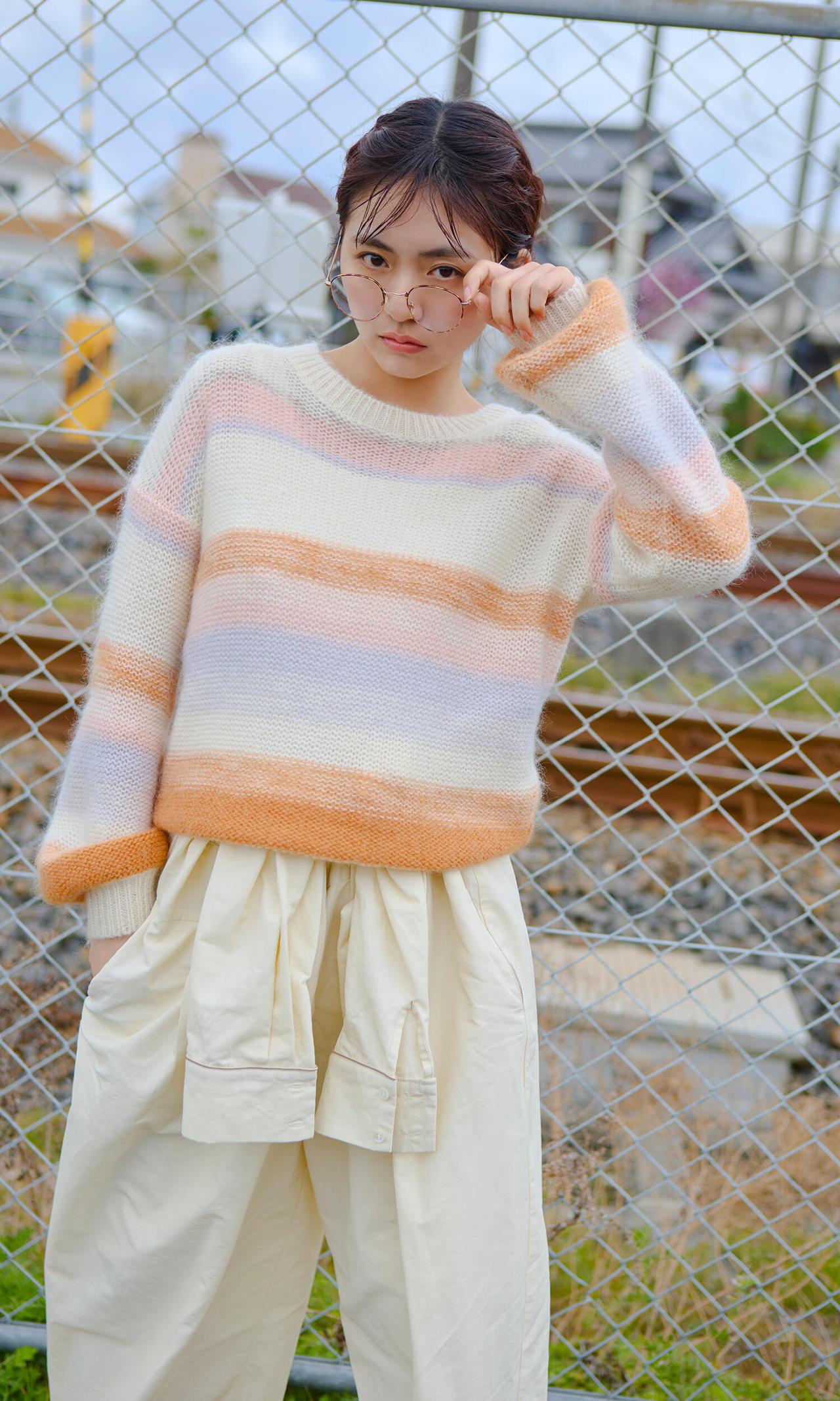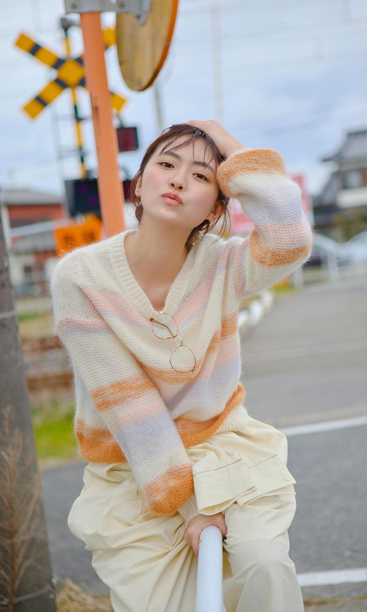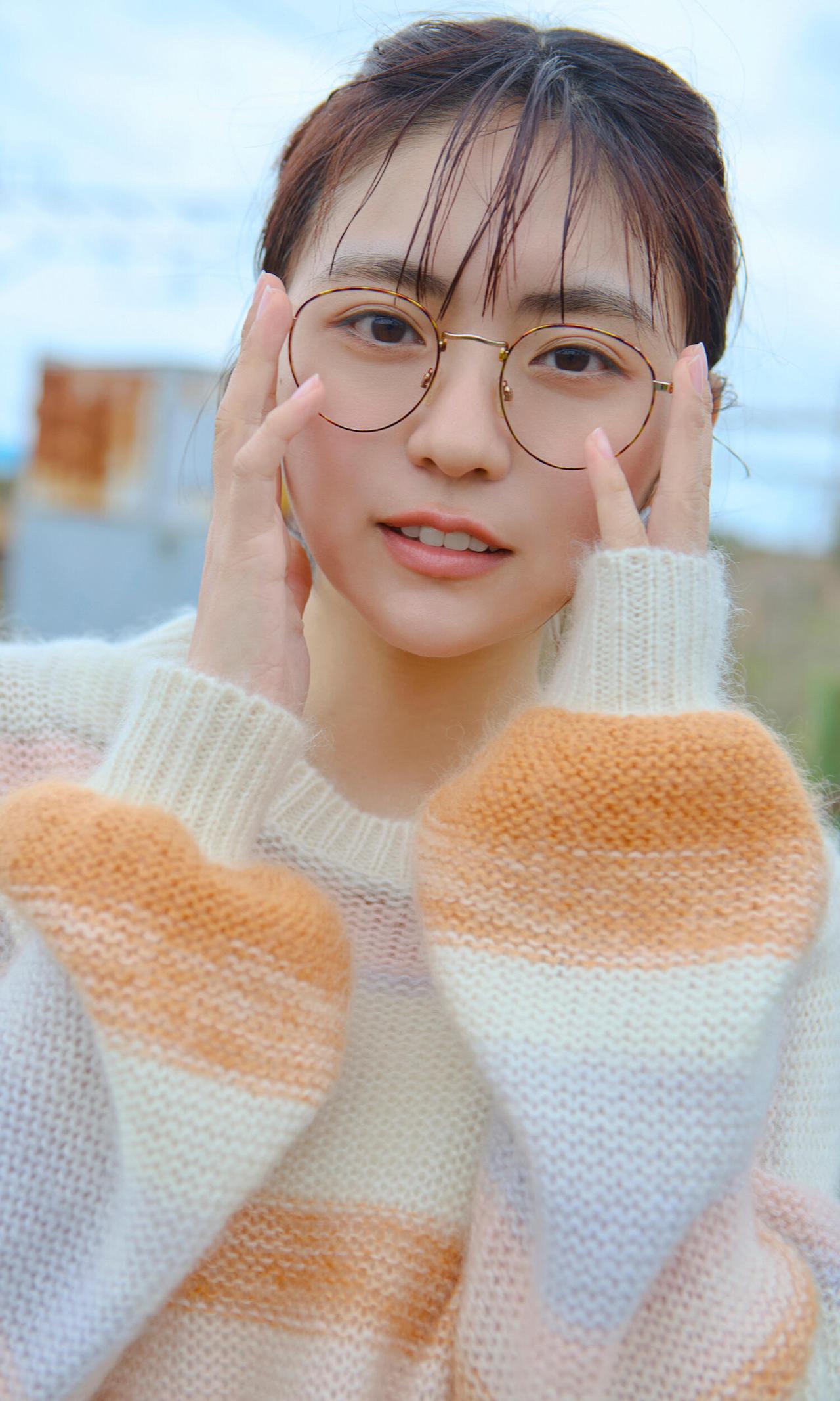 这姑娘戴眼镜,穿条纹毛衣,好可爱。