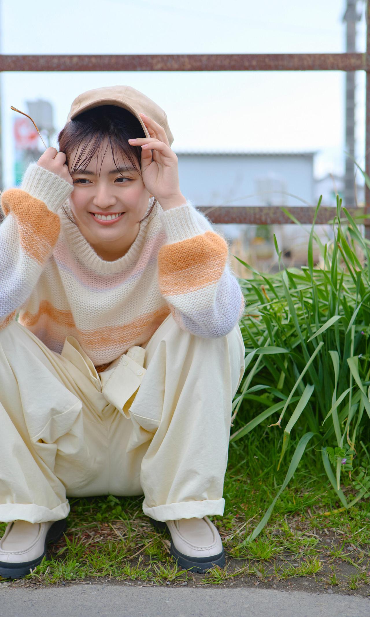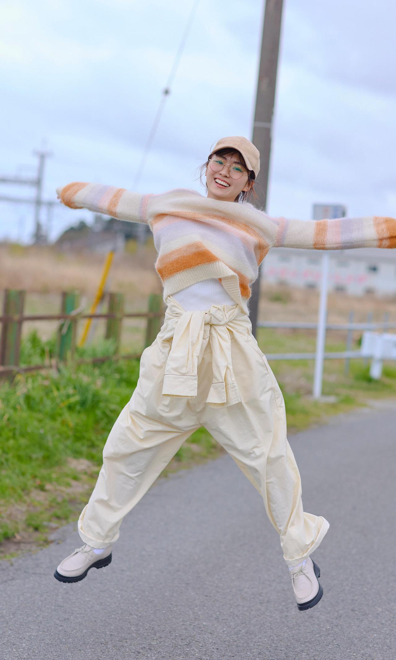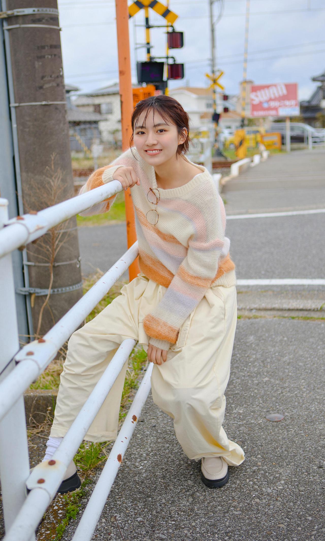 这姑娘戴眼镜,穿条纹毛衣,好可爱。