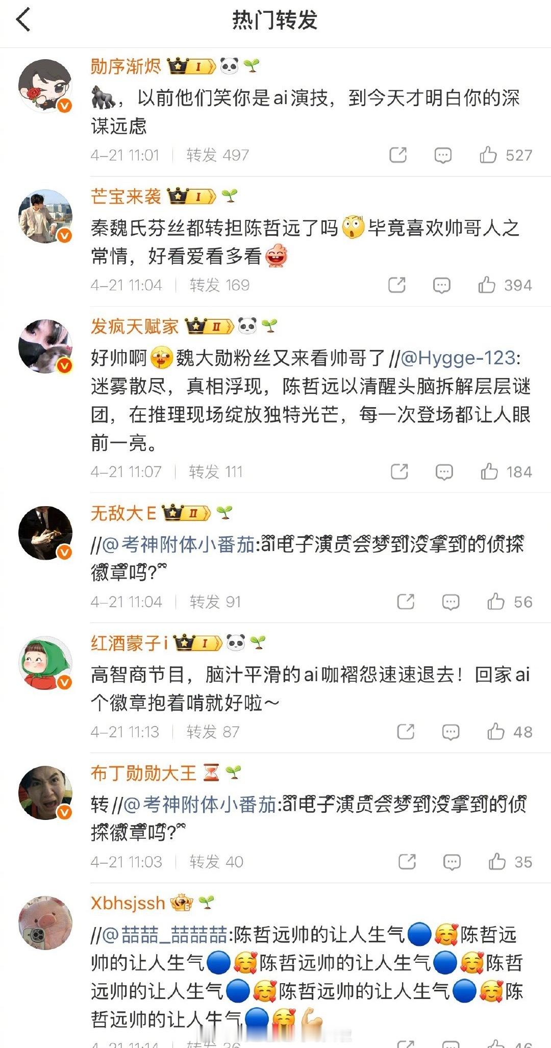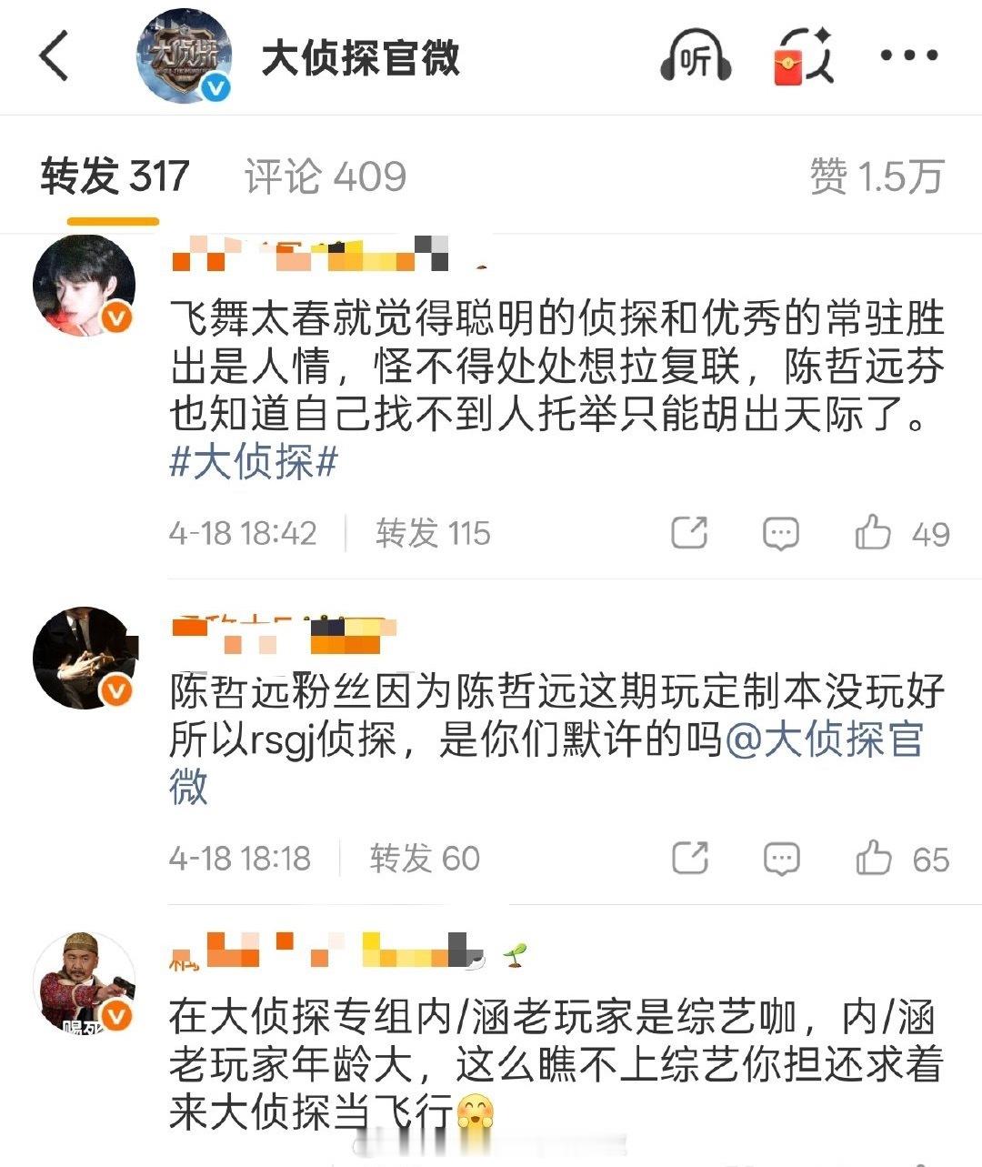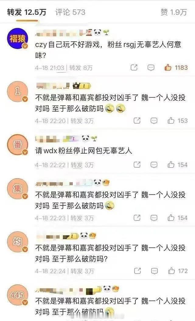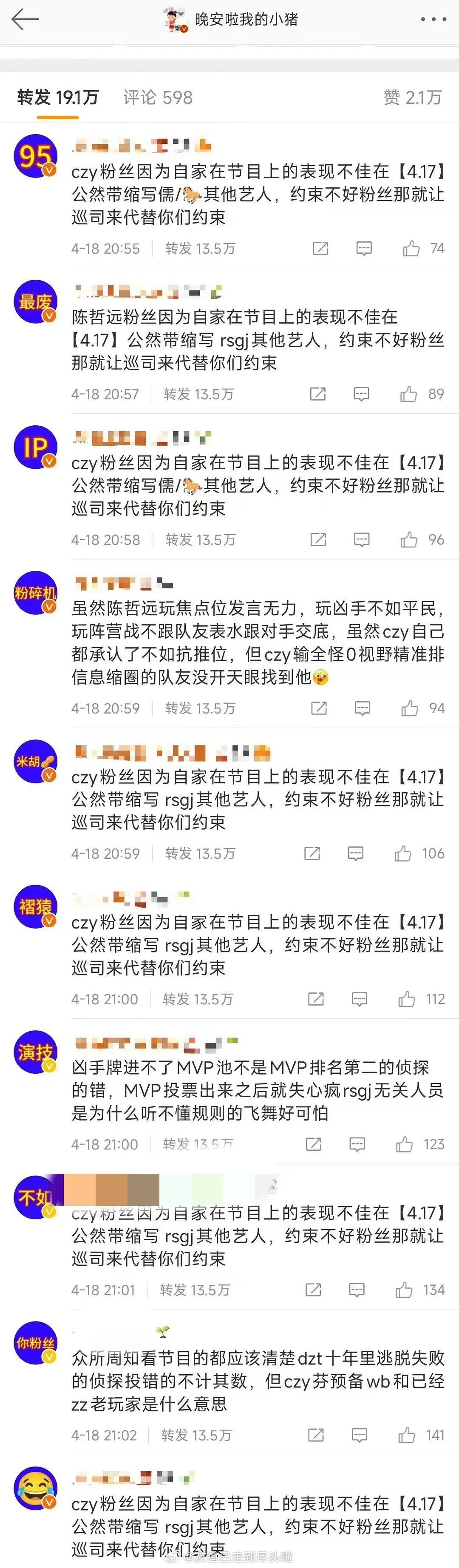 有人关注吗?陈哲远和魏大勋参加大侦探 ,投凶环节陈哲远投对了,魏大勋投错了关键是两家因此battle起来了,都觉得对方拖了自己后腿,勋粉觉得陈哲远游戏没玩好导致魏大勋投错,远丝觉得自己无辜被骂,目前两家都在节目博转发区互掀老底中