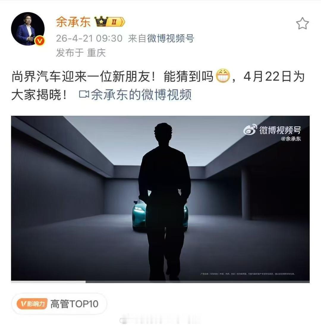余承东热情宣告:“尚界迎来新朋友!”会请谁呢4月22日19:00,鸿蒙智行春季新品发布会,尚界Z7、Z7T车型与神秘代言人将一同揭晓!