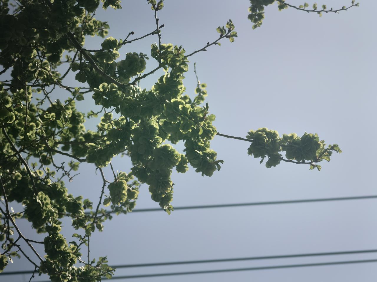 天,薄阴。 山楂树的叶子,绒绒的绿着。半开的叶片,像小姑娘的小抓髻。 仰拍,须增