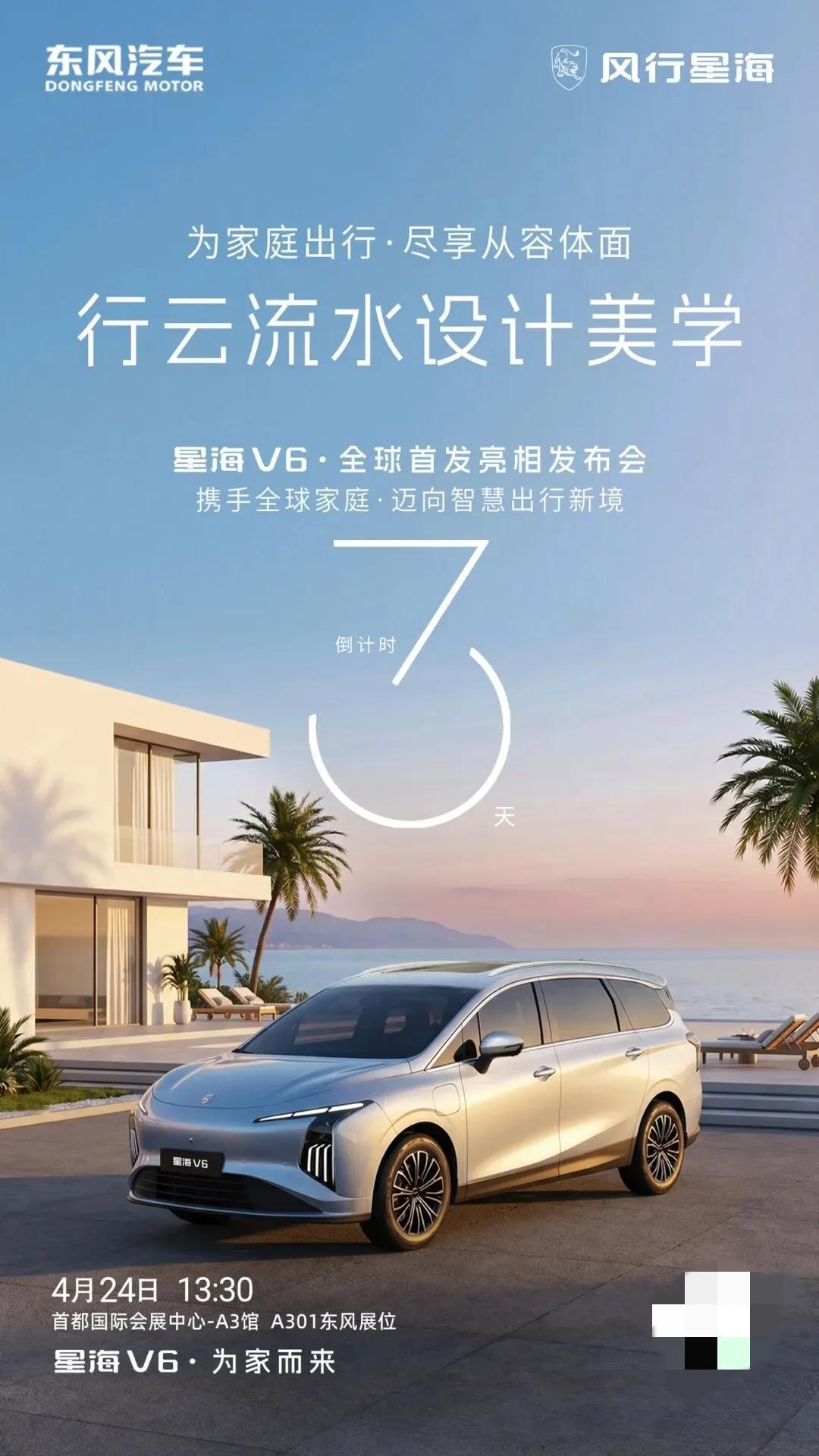 2026 北京车展(4 月 24 日) 将全球首发 风行星海 V6。 该车是东风风行与华为深化合作的核心成果,搭载华为乾崑智驾系统,定位为家庭出行场景打造的全新战略车型,将在车展上全面公布详细参数。