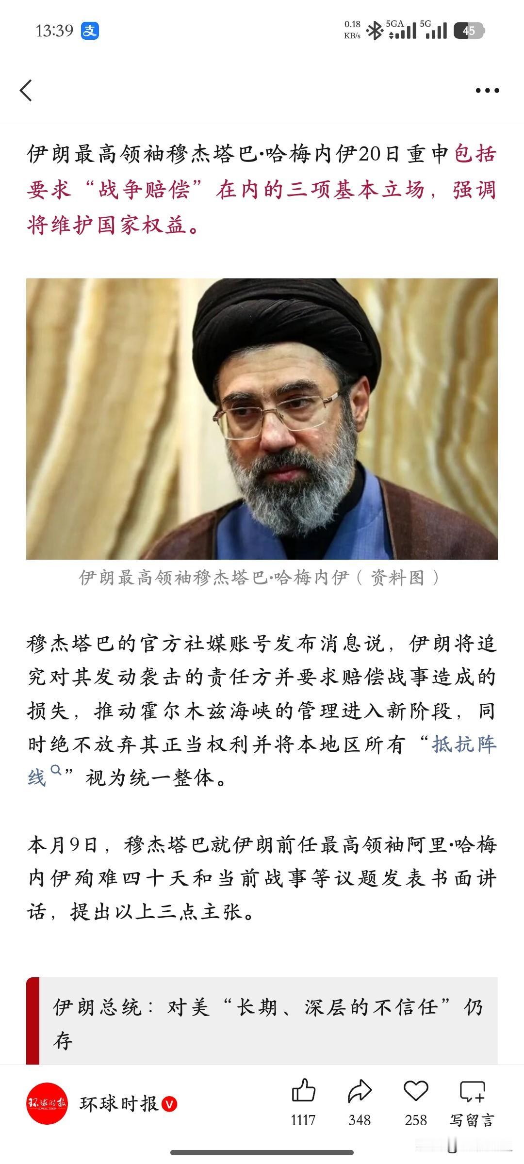 穆杰塔巴重申三项立场:1 要求战争赔款,2 霍尔木兹海峡管理进入新阶段,3 抵抗阵线是一个整体。 要求战争赔款这个立场,是切切实实地在打美国的霸权。美国历史上唯一一次接近战败赔款的事件是古巴“猪罗湾事件”,这也不是美国军队自己下场,支付的费用也是赎回俘虏的费用。这个口倘若开了,老特就是美国历史上最差的总统了。伊朗真的能逼迫老美支付战争赔款,那么真的可以直接宣告美国霸权的衰弱。这一条件,美国是无论如何都不可能同意的。 第三个立场,事实上就是要维护和帮助黎巴嫩真主党。在美伊停战期间,以色列一直在持续组织大量兵力攻打真主党,前两天好不容易谈了个停火10天,昨天以军又开始进攻真主党了。很明显,以色列想趁美军下场的这个机会,一举消灭北部黎巴嫩真主党的威胁。 伊朗和真主党是协同作战的战友,是不能抛弃对方的。在战争中抛弃(背叛)盟友是不会有好下场的。
