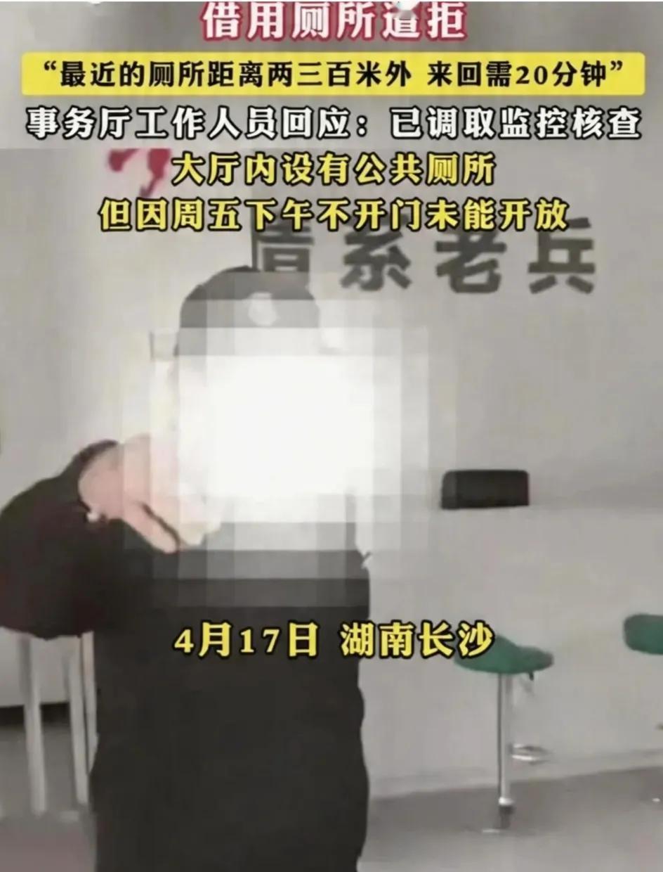 长沙退役军人借厕所被拒,领导第一反应:查监控!太让人心寒了 最近长沙这件事,真的越看越生气。一位退役军人急着上厕所,去相关单位求助,保安直接说不开放,拒绝让他使用。 老兵都快憋不住了,情急之下说明情况,可领导来了不先解决急事,反而先说要查监控。明明大厅就有厕所,外面公厕来回要20分钟,明明是举手之劳,却被冷冰冰的规矩挡在门外。 大家愤怒的不是一个厕所,而是对退役军人的态度。他们保家卫国,如今遇到一点急事,连个应急方便都得不到体谅。政策里明明写着要关爱老兵,连喝水、休息都要保障,可到了现实里,却如此冷漠。 同样的事,北京丰台当天就道歉、整改,态度诚恳。可长沙这件事发酵这么久,迟迟没有正式回应,实在让人寒心。 规矩是死的,人是活的。尊崇老兵,不是挂在墙上的口号,而是落在实处的温暖。希望能给老兵一个公道,也让这份尊重,真正看得见、摸得着。 (声明:观点不代表平台立场。部分资料、图片取自网络,如有侵权请联删除) 退役军人通道