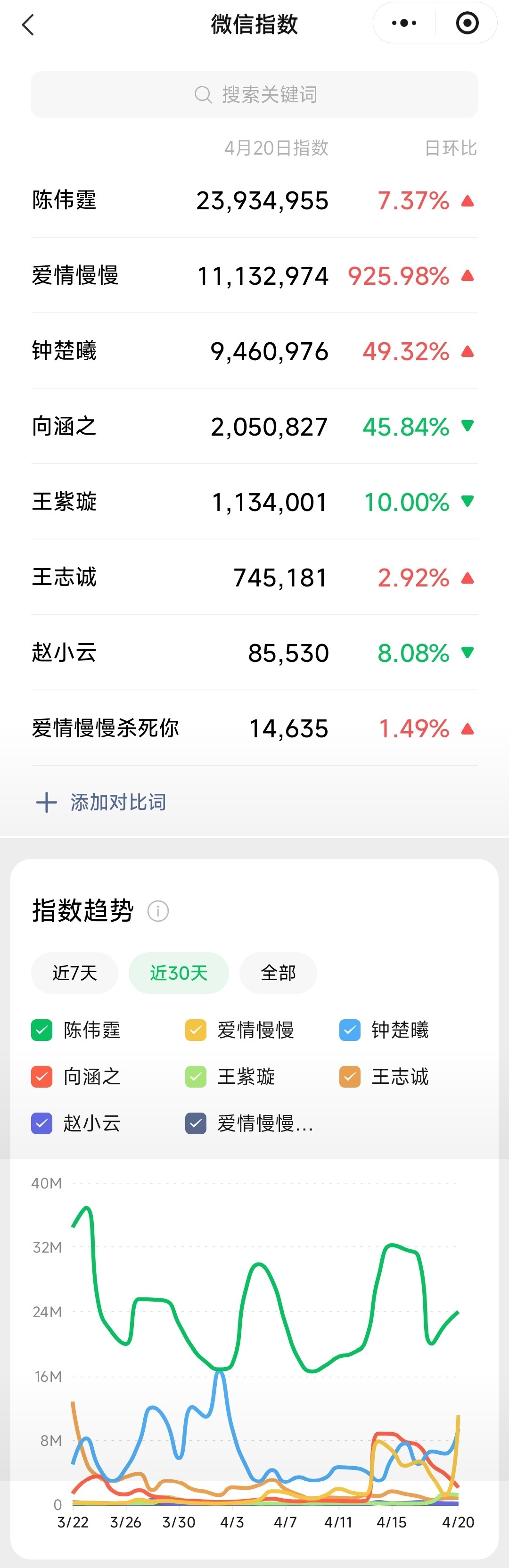 爱奇艺世界大会昨日微指排名,陈伟霆《爱情慢慢》第一,开机一个月,路透全平台爆火,两部待播剧《爱情慢慢》和《九门》德塔文同时上榜,且都作为一番男主数据领跑。 陈伟霆看到孩子走不动路