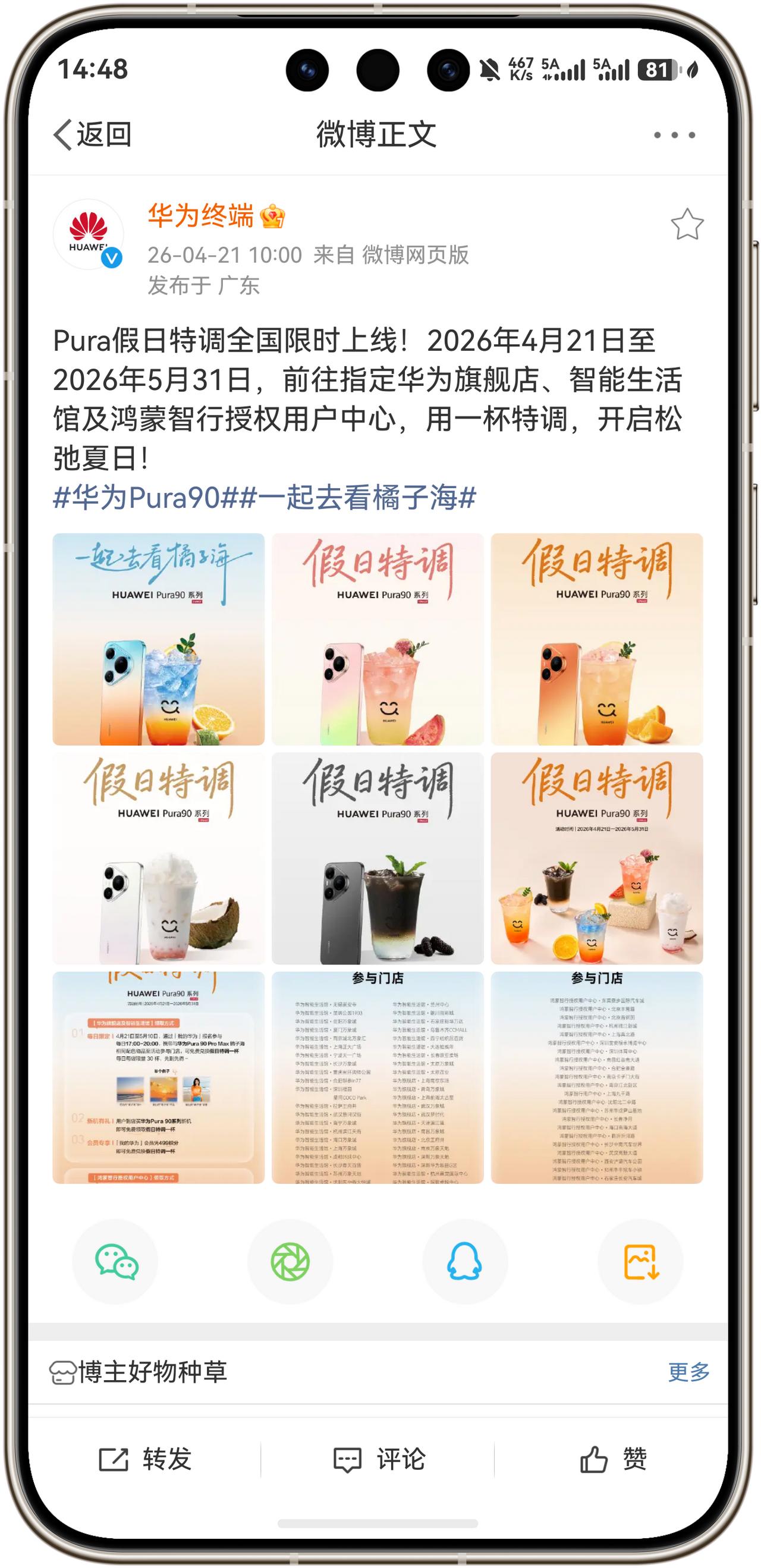 华为Pura假日特调饮料来了!2026年4月21日至2026年5月31日,去到指定的华为旗舰店、智能生活馆及鸿蒙智行授权用户中心即可领取,数量有限,先到先得!看看有没有你的城市吧!