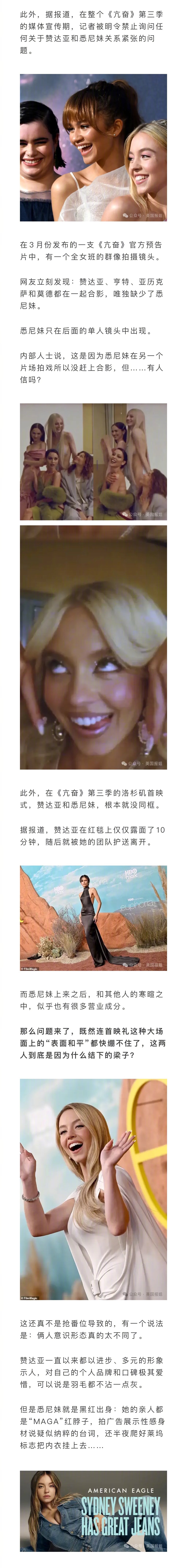 《亢奋》第三季开播,女主演赞达亚却和最近异军突起的新晋顶流悉尼妹在宣传期0互动?知情人士爆料:荷兰弟来探班赞达亚时,悉尼妹一直表现得过于热情暧昧,俩人就掰了……