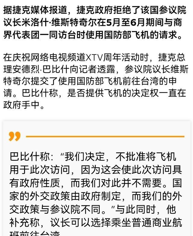 据卫通社报道,捷克总理已经拒绝了捷克参议院议长米洛什·维斯特奇尔使用国防部飞机随同所谓的商务代表团企图“访台”的申请。理由是他认为使用国防部飞机具有政府性质,捷克政府对此并不需要,并强调说,国家的外交政策由政府决定,与参议院不同。实际上,在过去几年,捷克在涉台问题上也是跳的比较高的几个国家之一。、 事情闹到今天,关键已经不是谁坐什么飞机,而是谁代表捷克对外发出信号。 按2026年4月20日报道,捷克总理安德烈·巴比什拒绝为参议院议长米洛什·维斯特奇尔提供国防部飞机。巴比什的说法很明确:一旦动用国防部飞机,这趟行程就会带上政府性质,而国家外交政策应由政府来定,不是由参议院来定。 不过他也没有直接拦下整趟行程,而是表示,对方若坚持前往台湾地区,可以自己改乘民航。这里面最耐人琢磨的地方,恰恰在这个“拒绝专机、但不彻底叫停”。 说得直白一点,政府是在切割责任:你要去,是你的决定;但别让外界把它看成捷克行政当局正式推动的动作。如果只看捷克官方的纸面立场,其实并不模糊。 捷克外交部门公开写明,捷克和欧盟一样执行“一个中国政策”,不与台湾地区建立外交关系,但会在经贸、文化、教育、科研、旅游等领域保持非官方合作。所以,捷克今天的问题,不是文件上有没有写清楚,而是现实政治里,政府口径和议会动作并没有真正对上。 再往前看,这种错位不是今年才有。2026年3月4日,捷克参议院刚刚通过一项支持台湾地区“有意义参与”部分国际组织活动的决议。 这个动作本身已经说明,参议院系统在涉台问题上并没有降温,反而还在继续往前推。也正因为这 样,4月这次专机风波才显得格外敏感,它并不是孤立事件,而是前面一连串动作的延续。 维斯特奇尔本人也不是第一次卷进这类争议。2020年9月,他就曾率团前往台湾地区,当时立刻引发中方强烈反应。 此后几年,捷克政坛里围绕台湾地区的声音一直没断过,参议院尤其活跃。到了2024年,捷克和台湾地区之间的互动又往前迈了一步。 路透社2024年3月19日报道,台湾地区副领导人当选人萧美琴窜访捷克;同年10月,台湾地区前领导人蔡英文又到布拉格参加论坛并会见当地政界人士。一个是当选副手,一个是刚卸任的前领导人,这两次行程叠加在一起,已经让中捷之间的敏感点明显增多。 更让局势复杂的是,2025年6月,捷克军情部门披露,中国外交人员在萧美琴2024年访捷期间曾实施跟踪,并策划带有威慑性质的行动;中方随后否认存在不当行为。无论外界如何解读,这件事至少说明,布拉格在涉台议题上已经不只是“表态”问题,而是被推到了更高敏感度的外交摩擦区。 再看巴比什这边,背景也变了。路透社报道显示,巴比什在2025年12月重新组阁上台后,一直强调要搞“更务实的外交”,把贸易、投资和企业利益放回更靠前的位置。 他这次批评维斯特奇尔,甚至直接说过去这类台湾地区行程伤害了捷克的生意。这个表态很现实,也很清楚:和前一届政府相比,他更不愿意为了政治姿态去承受对外经贸上的代价。 这样一看,这次拒绝提供专机,释放出的信号就不难理解了。它不是捷克对台政策发生根本逆转,也不是参议院那条线突然停下,而更像是政府在踩刹车,想把事情控制在一个不至于进一步外溢的范围内。 政府要守住正式外交身份,参议院还想保留操作空间,双方都没有完全退,但都在重新算账。只要正式政策和实际动作长期分离,外界就很难相信布拉格释放出的信号是稳定的。 今天政府能拒绝一次专机,算是在降温;可参议院如果继续往前拱,摩擦点还会反复出现。