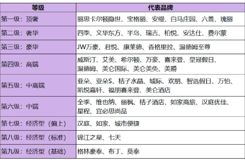 常见的酒店分级 1️⃣第一级:顶奢 丽思卡尔顿隐世、宝格丽、安缦、白马庄园、六善、瑰丽 2️⃣第二级:奢华 四季、文华东方、半岛、瑞吉、柏悦、安达仕、费尔蒙 3️⃣第三级:豪华 JW万豪、君悦、康莱德、香格里拉、温德姆至尊 4️⃣第四级:高端 威斯汀、艾美、希尔顿、万豪、喜来登、皇冠假日、温德姆、美仑国际、美仑美奂、美爵 5️⃣第五级:中高端 亚朵、亚朵S、桔子水晶、城际、欢朋、智选假日、万怡、凯悦嘉轩、福朋喜来登、美仑酒店 6️⃣第六级:中端 全季、维也纳、丽枫、桔子酒店、如家商旅、汉庭优佳、星程、宜必思尚品 7️⃣第七级:经济型(偏上) 汉庭、如家、城市便捷 8️⃣第八级:经济型(标准) 锦江之星、七天 9️⃣第九级:经济型(基础) 格林豪泰、布丁、莫泰