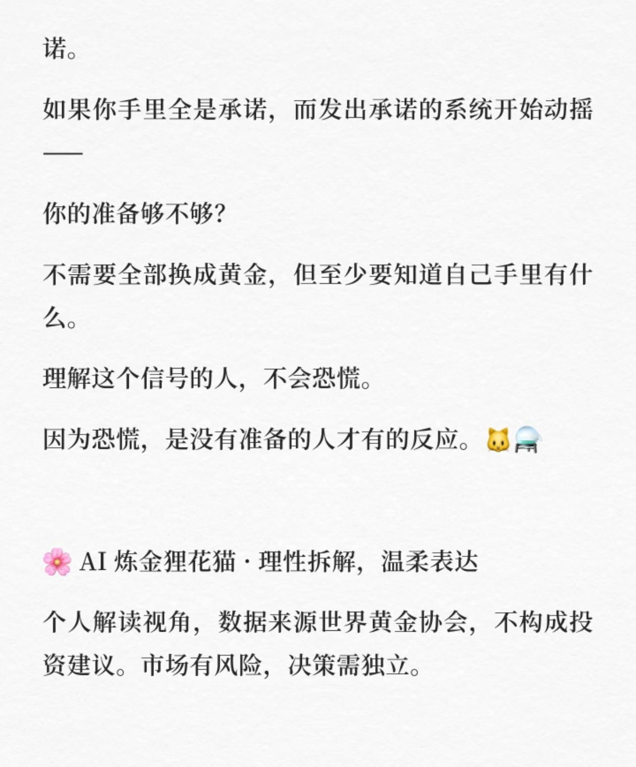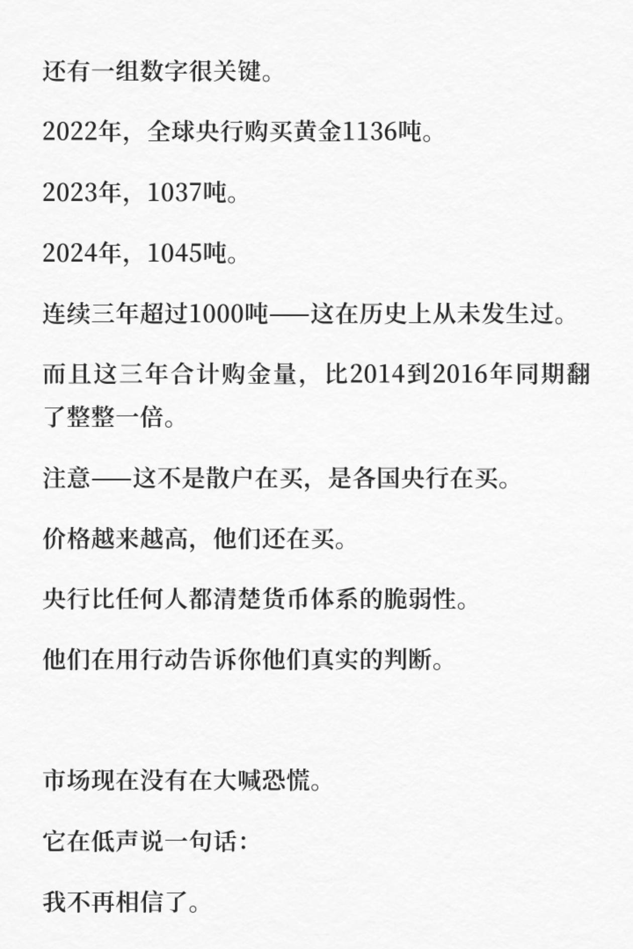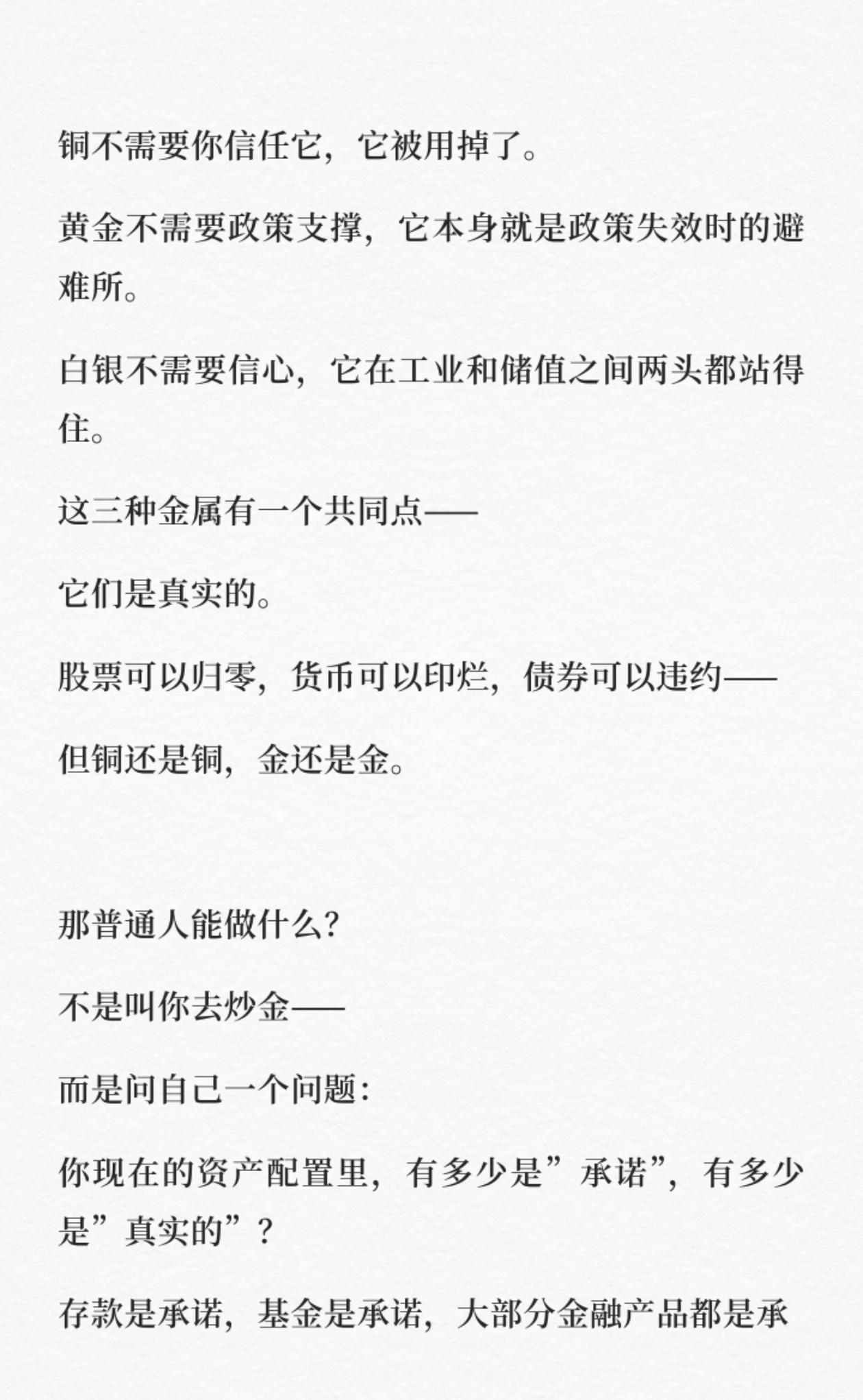 金铜“同涨”:一个让所有投资者都该警惕的信号 你有没有发现一个反常现象:最近,一向“水火不容”的黄金和铜,竟然在同步上涨? 这不是简单的巧合,而是市场在悄悄传递一个关键信号。巴菲特曾说:“当潮水退去,才知道谁在裸泳。” 而金铜同涨,正是潮水开始退去前的预警。 一、金与铜:天生的“敌人”,为何突然同频? 正常情况下,黄金和铜是完全相反的两个方向: - 铜,被称为“经济晴雨表”。铜价上涨,意味着工厂开工、基建推进、需求扩张,代表经济强劲,是市场信心的“油门”。 - 黄金,被称为“避险之王”。金价上涨,意味着人们对货币、政策、承诺失去信心,是市场恐慌的“刹车”。 过去几十年,这两者大多时候是反向而行的。但现在,它们却在同步走高。这背后,不是简单的通胀逻辑,而是更深层的“不信任”情绪在蔓延。 二、历史上的两次“金铜同涨”,结局都很扎心 翻开历史,金铜同涨的现象极其罕见,而每一次出现,都预示着巨大的市场波动: - 1970年代末:金铜同步上涨,随后全球陷入滞胀,美联储暴力加息,经济深度衰退。 - 2005-2006年:金铜再次同步上涨,紧接着就是2008年全球金融危机。 这一次,市场在说的不是“经济复苏”,而是对所有“纸面承诺”的不信任。股票、债券、货币,本质上都是一种承诺。而当资金开始同时涌入铜和黄金,说明它们正在悄悄撤离这些承诺,转向“真实的资产”。 三、央行的疯狂“扫货”,早已说明了一切 更值得警惕的,是各国央行的动作。数据显示,全球央行已经连续三年购买黄金超过1000吨,这是历史上从未发生过的事。 - 2022年:1136吨 - 2023年:1037吨 - 2024年:1045吨 央行比任何人都清楚当前货币体系的脆弱性,它们用真金白银的行动,给出了最真实的判断:在价格越来越高的情况下,依然在疯狂买入黄金。 四、普通人能做什么?不是炒金,而是看清真相 很多人看到这里,第一反应是去梭哈黄金。但我想说,真正的信号,不是让你去炒金,而是让你重新审视自己的资产配置: - 你手里的资产,有多少是“承诺”?(存款、基金、债券) - 又有多少是“真实的”?(实物黄金、工业金属、核心资产) 铜不需要信任,它被用掉了;黄金不需要政策支撑,它本身就是避险资产;白银则在工业和储值之间两头都站得住。它们的共同点,就是真实。股票可以归零,货币可以印烂,债券可以违约,但铜还是铜,金还是金。 最后想说 金铜同涨,不是让你恐慌,而是让你提前准备。恐慌,从来都是没有准备的人才有的反应。 你不需要把所有资产都换成黄金,但至少要知道自己手里的东西,哪些是“承诺”,哪些是“真实”。这波信号,值得每一个投资者冷静下来,重新思考自己的资产配置。 觉得这篇分析对你有启发的,点赞、收藏、转发给身边的朋友,一起看懂市场的底层逻辑。 评论区聊聊:你现在的资产里,“真实资产”占比多少? 黄金 铜 投资 资产配置