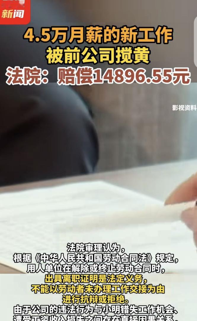 深圳,一男子辞职后,找了份月:薪45000元的工作,可把他乐坏了,万万没想到,前公司竟然给他搅黄了,说他“工作交接没完成”,就是不给他开离职证明。新公司一看男子这么大的麻烦,直接撤回录用通知,男子勃然大怒,直接把前公司告上法庭,法院判了。 深圳一名男子在原公司任职多年后,觉得发展空间有限,便主动提出辞职,希望能找到更适合自己的平台,辞职流程启动后,他顺利通过了多家企业面试,最终拿到了一家新公司的录用通知。 对方给出的月薪高达45000元,远超他此前的薪资水平,拿到这份高薪offer时,男子满心欢喜,觉得自己的职业规划迈出了关键一步,对未来的工作和生活充满期待。 按照新公司的入职要求,离职证明是必备材料,用于确认劳动关系已合法解除,避免用工风险,男子随即联系前公司人事部门,申请开具离职证明,可让他始料未及的是,前公司直接拒绝了他的请求,给出的理由始终是"工作交接未完成",除此之外没有任何其他说明。 男子多次与前公司沟通,解释这份证明对入职新工作的重要性,甚至主动提出可以配合完善剩余交接事项,但公司始终不为所动,坚持以交接未完成为由,迟迟不肯出具证明。 随着入职日期临近男子依旧没能拿到离职证明,新公司那边也不断催促,新公司在多次沟通无果后,出于合规风险的考量,担心录用存在劳动关系纠纷的员工会带来后续麻烦,最终正式向男子发出了录用通知撤回函,明确表示因无法提供合规离职证明,不再录用他。 辛苦争取来的高薪工作就此泡汤,男子从满心期待跌入谷底,前公司的刻意阻拦,让他眼睁睁看着大好机会化为泡影,愤怒之下男子决定通过法律途径维护自身权益,将前公司告上法庭,要求对方赔偿因拒开离职证明导致自己错失高薪工作的经济损失。 法庭上前公司依旧以工作交接未完成、未归还相关密钥、曾将公司资料上传个人网盘等理由辩解,认为自己不开具证明的行为合理合法,法院审理后明确指出,用人单位在解除或终止劳动合同时,出具解除或终止劳动合同的证明是法定义务,必须在劳动关系终止时依法履行。 这项义务不能附加任何前置条件,更不能以劳动者未完成工作交接为由进行抗辩或拒绝,工作交接与出具离职证明属于两个独立的法律关系,即便双方存在交接争议,公司也应通过协商、仲裁等合法途径解决,而非扣留离职证明阻碍劳动者再就业。 同时法院认定,男子已拿到新公司的正式录用通知,因前公司拒开证明导致无法入职,最终被撤回录用,两者存在直接的因果关系,前公司的违法行为直接造成了男子的工资收入损失,结合案件事实、公司过错程度以及男子的实际损失情况,法院最终作出判决,判令前公司向男子赔偿经济损失共计14896.55元。 这起案件也给不少企业敲响了警钟,劳动者依法享有平等就业的权利,离职证明是保障劳动者顺利再就业的关键材料,用人单位必须严格履行法定义务,不能滥用权力恶意阻拦员工离职再就业,否则不仅要承担相应赔偿责任,还会影响企业自身的合规形象与口碑。