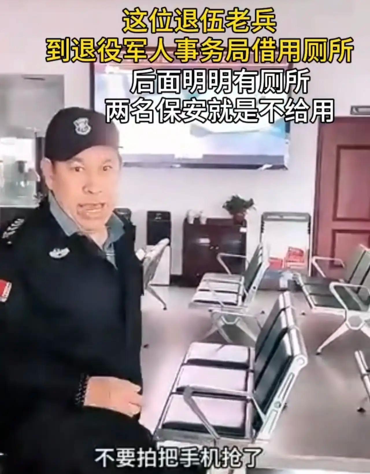 “娘家的厕所都不能上了”?看到退伍军人到退伍军人事务局上厕所被拒,心里真的不是个滋味。生活中处处张贴着军人优先,到这里被两个保安给破坏了,况且还是“娘家”的保安。 退伍老兵周先生,在服役期间为了救战友,右腿被重物砸伤,所以落下终生残疾。 4月17日,他拄着拐来到退伍军人事务厅上厕所,由于外面最近的厕所要绕高架桥来回20分钟,对于拄拐的他并不方便走路。没想到进门说好话,还是被保安拒绝。 第一,他是去退役军人事务厅办理优抚业务,不是专门去上厕所。 第二,他已经说好话叫“大哥”了,没有趾高气傲,姿态很低。 第三,明明里面就有厕所,也有工作人员从里面出来,偏偏非得说没有厕所,让去外面上。即使这不是一名军人,看着拄着拐也得有同情心吧。 第四,工作人员都说了,让周先生到里面上厕所,保安依然不放。这分明是拿着鸡毛当令箭,有点小小的权利就为难人。 还有指着别人鼻子说话,大喊着抢手机,背着手一副“官老爷”的样子,这不是保安,是“大老爷”。 后续这两名保安肯定会被处理,甚至会被开除,可能还会道歉,又再还上一波保安。 从根上来说,这不是换不换保安的问题,这是管理不到位,培训没到位,用人单位有很大的责任。事务厅回应周五下午不营业,正在核查。既然周五不营业,更应该广而告之前来办事的人员,免得再跑一趟。 军人为保卫国家保护人民付出了莫大的牺牲,不应该上个厕所就受到拒绝,这不是单单是个人素质的问题,更是思想的问题。