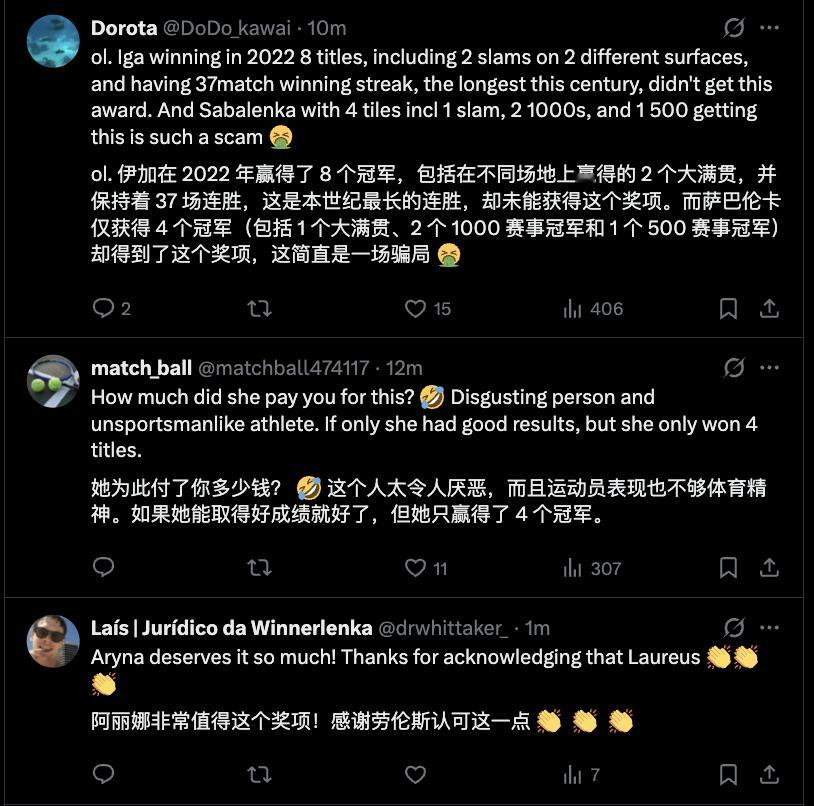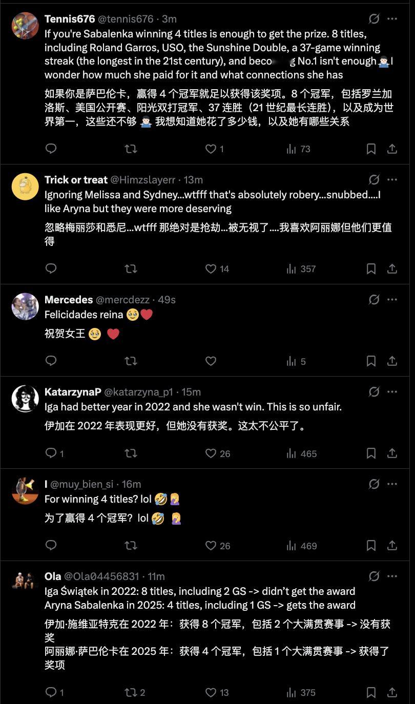 萨巴伦卡获劳伦斯最佳女运动员 在外网萨巴得奖的评论区,有一些观众质疑为何斯瓦泰克2022年没有得奖,当年她拿到两个大满贯、取得一波37连胜、拿到8个冠军、巴蒂退役后一直保持世界第一,但未能得到劳伦斯佳女的青睐。