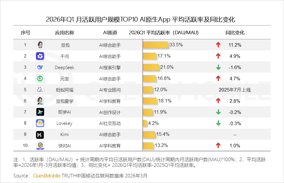 QuestMobile:2026年一季度AI应用洞察,豆包、千问、DeepSeek月活分别达到3.4亿、1.7亿、1.3亿,竞争进入下半场。