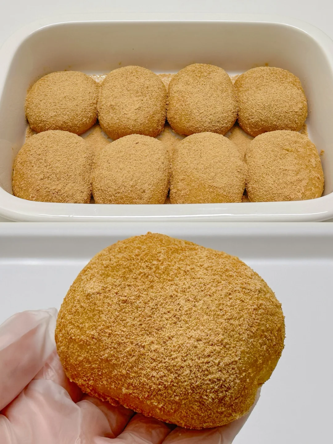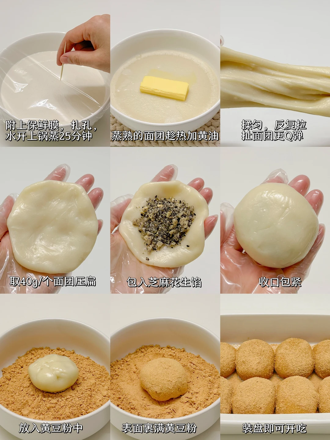 3️⃣蒸熟的面团趁热加黄油揉匀,反复拉扯面团更Q弹,取40g/个面团压扁,包入芝麻花生馅,收口包紧,裹上一层熟黄豆粉,装盘即可开吃。