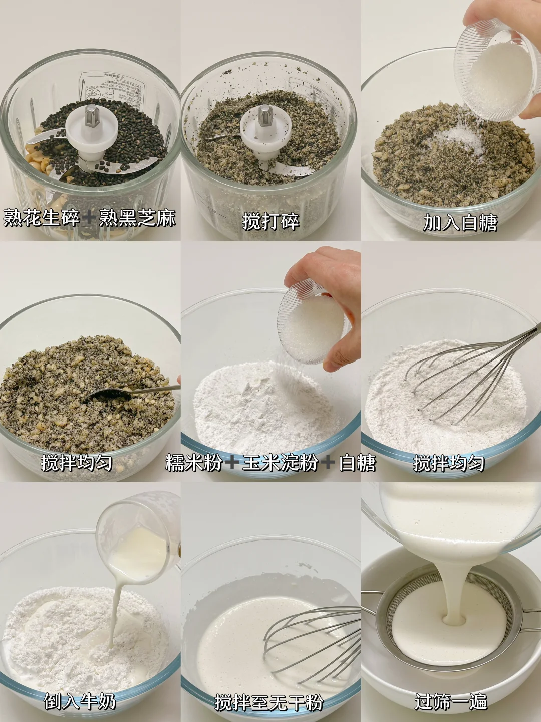 1️⃣熟花生碎加熟黑芝麻搅打碎,花生不要完全打碎,加入白糖搅拌均匀。