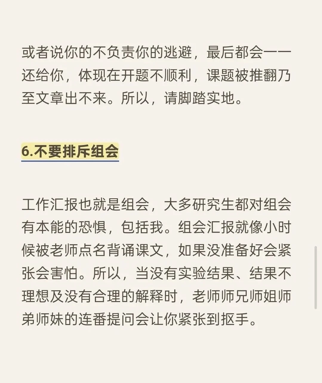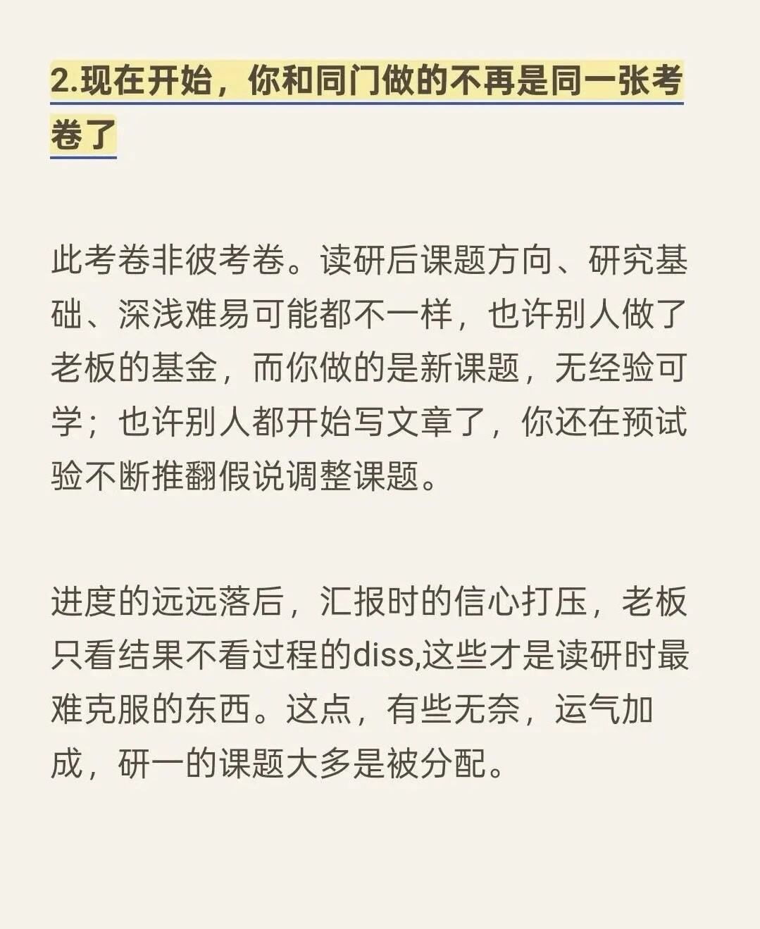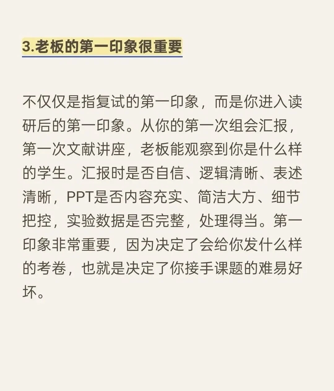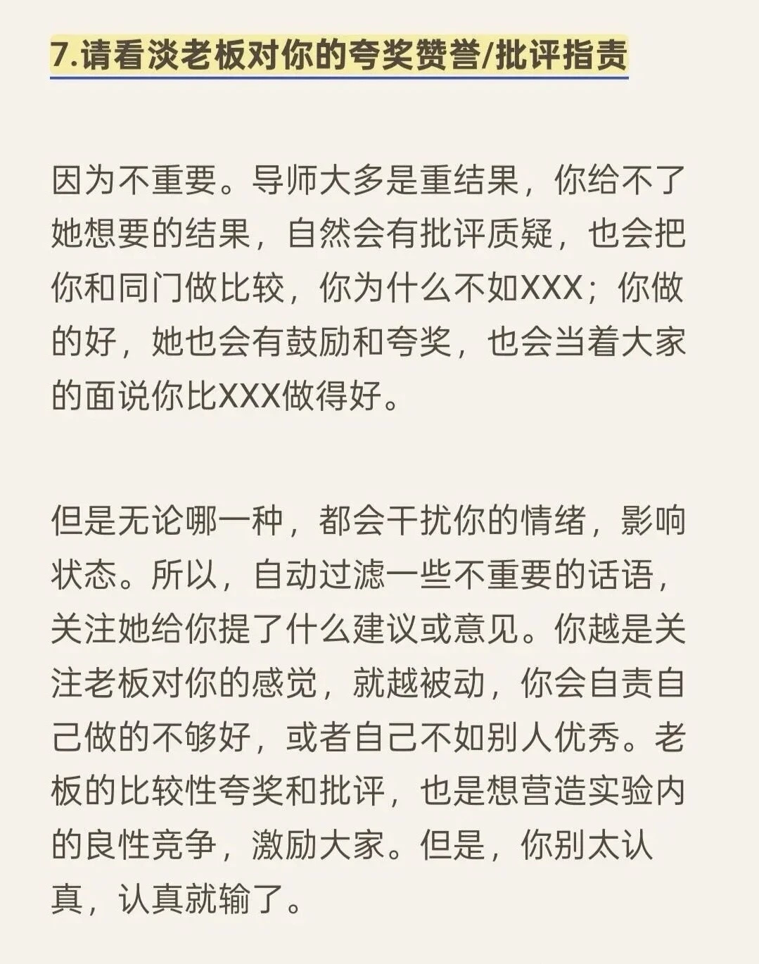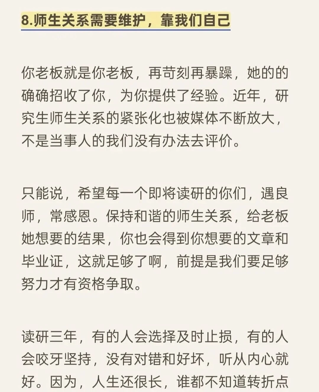 8.师生关系需要维护,靠我们自己 你老板就是你老板,再苛刻再暴躁,她的的确确招收了你,为你提供了经验。近年,研究生师生关系的紧张化也被媒体不断放大,不是当事人的我们没有办法去评价。 ◎ 只能说,希望每一个即将读研的你们,遇良师,常感恩。保持和谐的师生关系,给老板她想要的结果,你也会得到你想要的文章和毕业证,这就足够了啊,前提是我们要足够努力才有资格争取。 读研三年,有的人会选择及时止损,有的人会咬牙坚持,没有对错和好坏,听从内心就好。因为,人生还很长,谁都不知道转折点