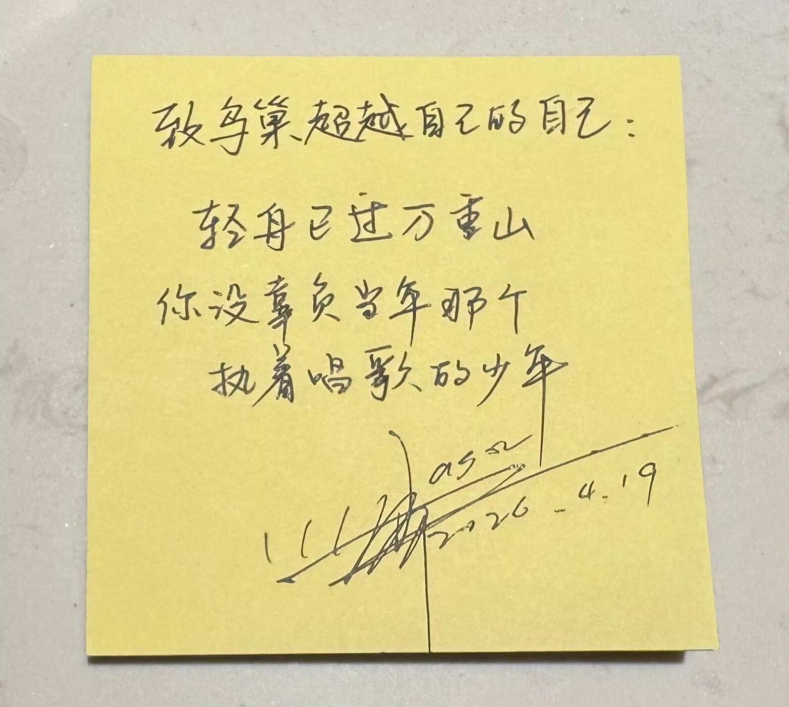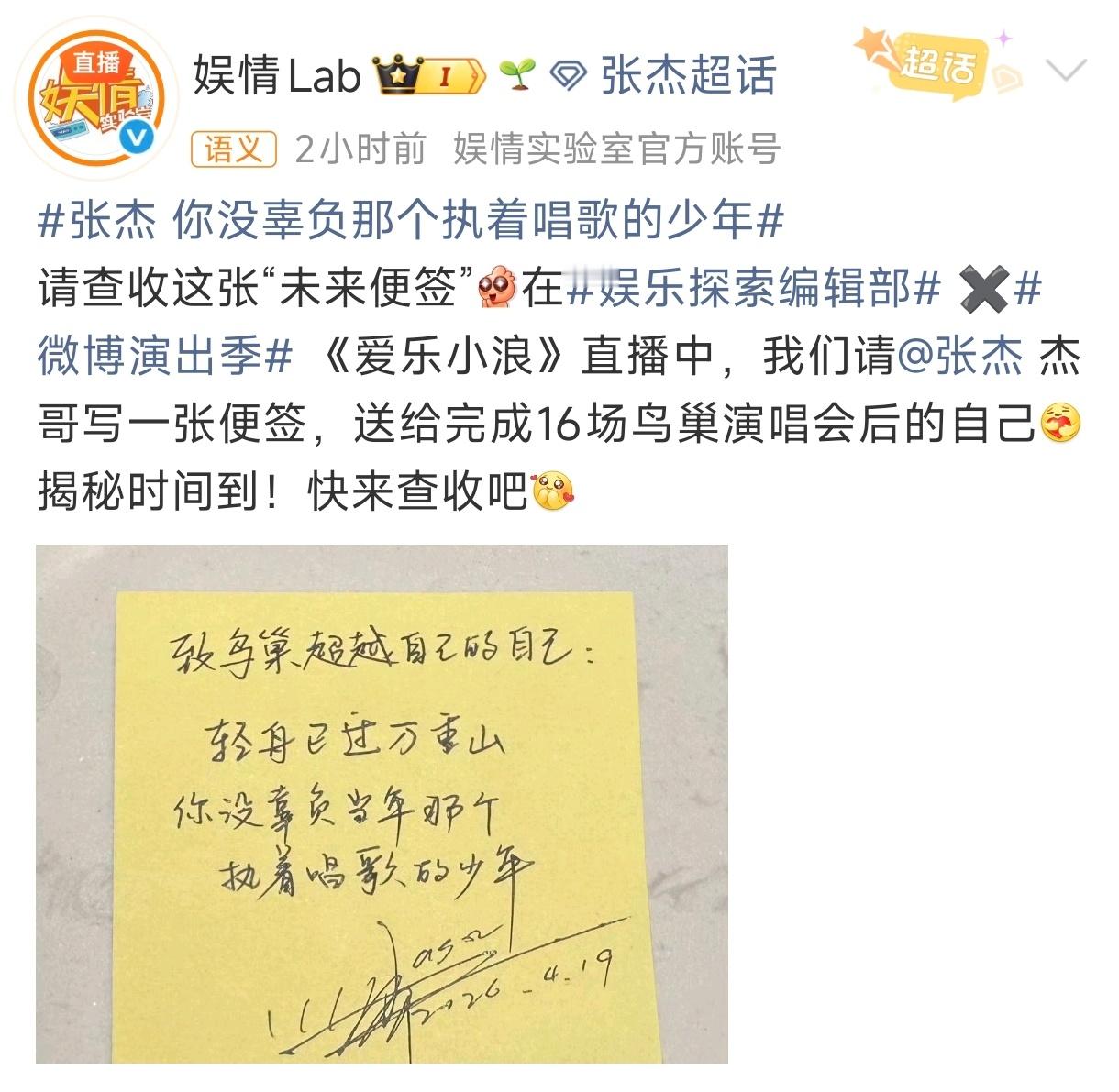 张杰致鸟巢超越自己的自己张杰写给自己的便签:致鸟巢超越自己的自己:轻舟已过万重山,你没辜负当年那个执着唱歌的少年!杰哥超棒张杰写给自己的便签