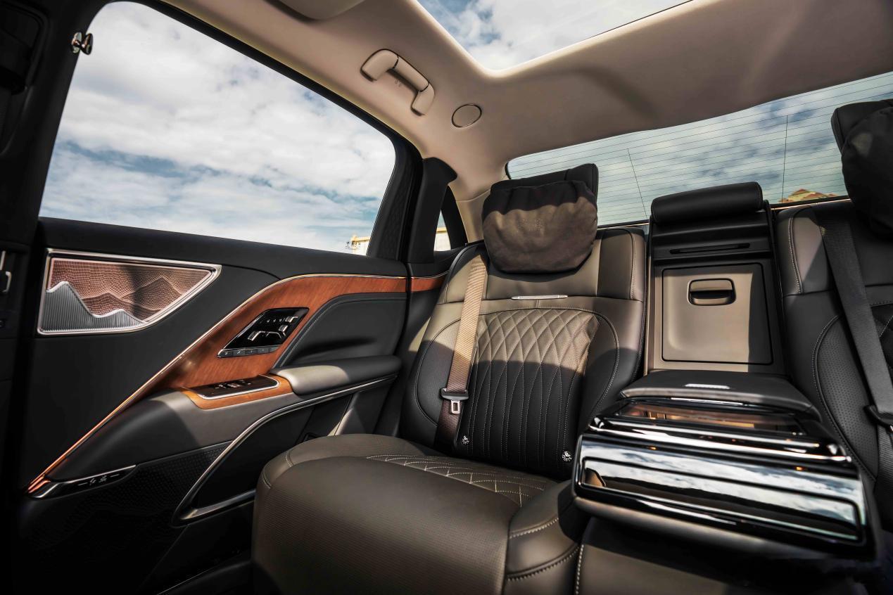 中控区域使用了一块4K曲面屏幕,配合AR-HUD抬头显示,科技感并不输给新势力。V6版本采用5座布局,V8版本则升级为4座行政座椅,后排配备了腿托、肩部调节和折叠小桌板。V8版还搭载了32扬声器的杜比全景声音响系统。坐进去的感受确实跟普通家用车不在一个层次。