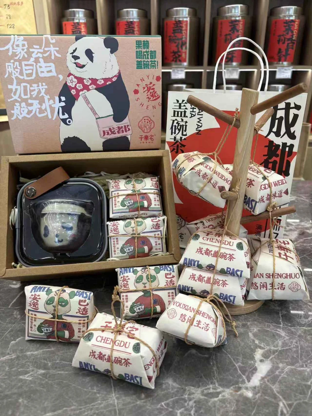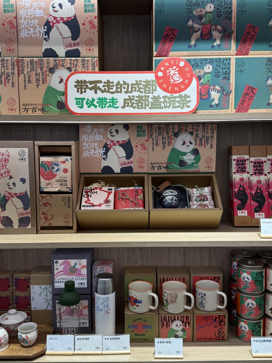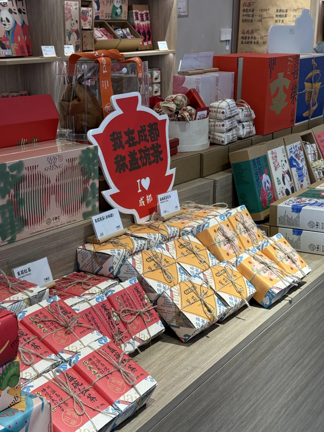 有吃的,有玩的,有玩儿的!还有超复古的盖碗茶伴手礼‼️现称现包的茶叶,小小的一包,非常有特色,是其他家都没有的特色搭配喔😉就在望平街巷子里👀店里还有超多熊猫周边,几十就能拿下😉