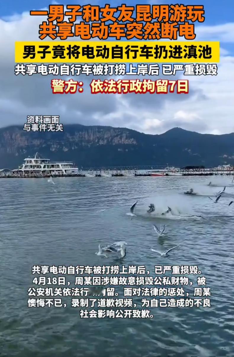 离谱!云南昆明,一对情侣去滇池享受二人世界,期间两人租了辆共享电动车,谁知骑上没多久就没电了,男子不满意,直接就把车子扔进滇池,气是出了,但自己也被拘留了7天 谁也没想到,会因为一辆共享电动车,闹出这么一场离谱又让人唏嘘的闹剧。 作为昆明的名片,滇池是国家级风景名胜区。 为了方便游客,滇池沿岸投放了不少共享电动车,颜色鲜艳,扫码就能解锁,价格也不贵。 事发那天,天气格外好,阳光明媚,微风不燥,一对情侣趁着好天气,想好好享受二人世界。 两人打扮得休闲清爽,手里提着简单的零食和水,一路上有说有笑,脸上都带着轻松的笑容,看得出来,对这次的滇池之行,充满了期待。 走到滇池沿岸的步道旁,两人看到停放在路边的共享电动车,商量了一下,决定租一辆,沿着湖边骑行,既能欣赏风景,又能节省体力。 他先让女友坐在后座,自己则跨坐在前座,调整好座椅,拧动车把,电动车缓缓启动,朝着湖边的步道骑去。 刚开始骑行的时候,一切都很顺利,电动车的速度不快不慢,刚好能让人看清沿途的风景。 两人偶尔低声交谈几句,氛围温馨又惬意,完全沉浸在二人世界的美好里。 可这份惬意,并没有持续太久,大概骑了十几分钟。 就在他们准备往滇池另一端的观景台骑行时,电动车突然慢慢降速,紧接着,就彻底停了下来,显然是没电了。 他试着重新扫码解锁,又退出小程序重新登录,可不管怎么操作,电动车依旧没有反应,始终无法启动。 此时的男子,心里已经泛起了火气,好好的二人世界,本来心情好好的,却被这辆突然没电的共享电动车扫了兴,越想越不耐烦。 越想越委屈,也越想越生气,一时间冲昏了头脑,做出了一个让人意想不到的举动。 男子双手抓住电动车的车把,用力一抬,将电动车扛了起来,到水边的护栏旁,双手一使劲,朝着的水面扔了下去。 “扑通”一声巨响,电动车落入水中,溅起一大片水花,水面上泛起一圈圈涟漪,电动车在水里浮了几下,就慢慢往下沉。 扔完电动车,男子长长舒了一口气,脸上的怒气似乎消散了不少,仿佛心里的委屈和不满,都随着这一扔,彻底发泄了出来。 可他不知道的是,自己这一时冲动的举动,不仅破坏了滇池的生态环境,还触犯了法律,更被当时在场的游客,用手机拍了下来。 民警随后联系上了该男子,通知他接受调查。 经过民警的调查和处理,最终,被公安机关依法行政拘留,同时还要承担赔偿费用。 原本只是想发泄一下怒气,没想到却换来拘留,还得赔钱,好好的二人世界,也因为这一时的冲动,彻底泡汤了。 这次男子扔共享电动车的事件,更是给所有游客敲响了警钟,不管遇到什么事情,都不能冲动行事,更不能触犯法律,破坏生态环境。 不要让一时的冲动,破坏了这份湖光山色,也不要让自己,因为一时的糊涂,触犯法律,留下终身的遗憾。 信息来源:光明网《男子为泄愤,将共享电动自行车扔入滇池!昆明警方:已刑拘》