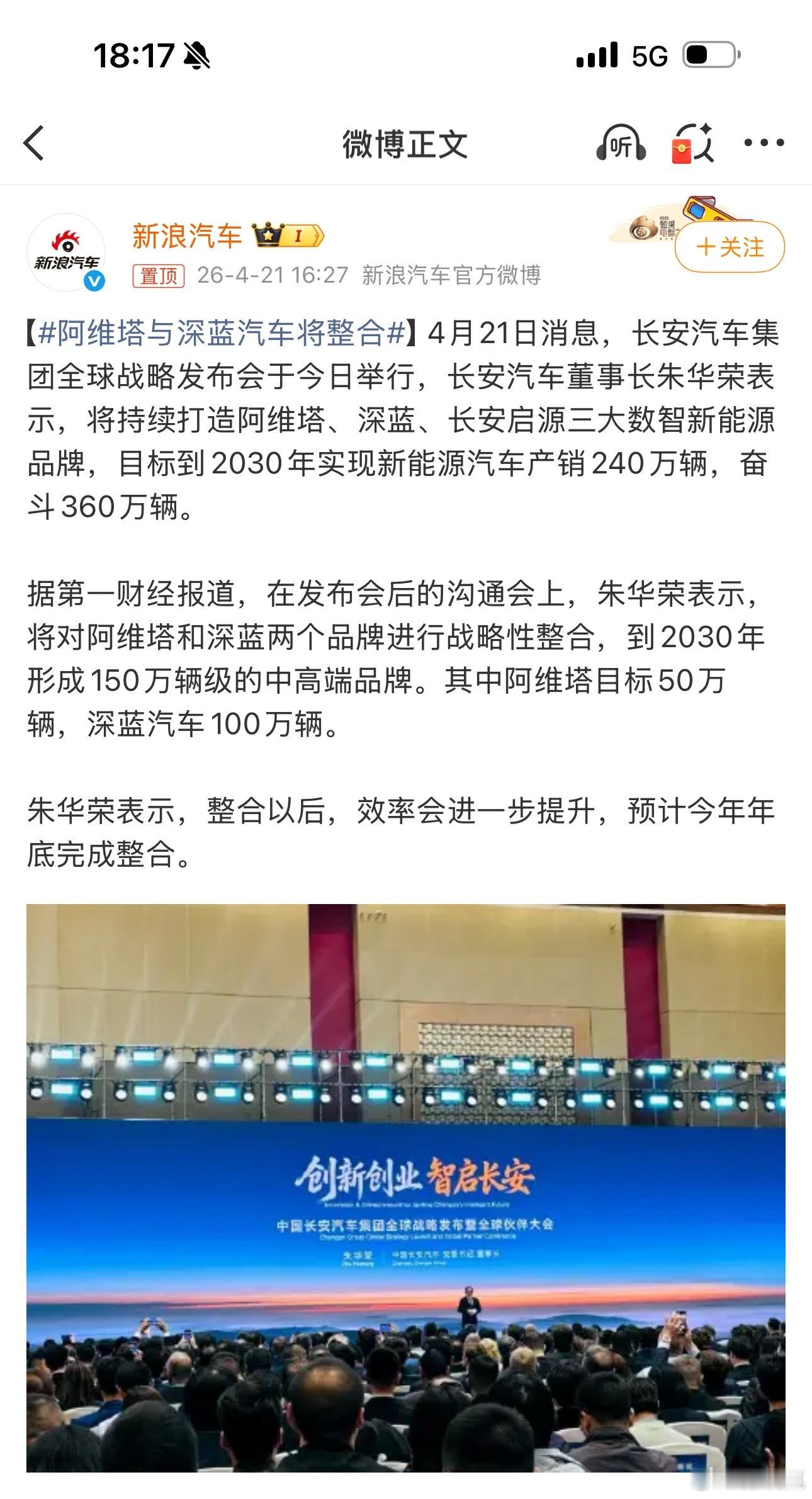 阿维塔与深蓝汽车将整合深蓝卖的很不错啊,S07和S05销量都很扎实。整合后预计到2030年深蓝100万辆,阿维塔50万辆,实现一加一大于二的效果。