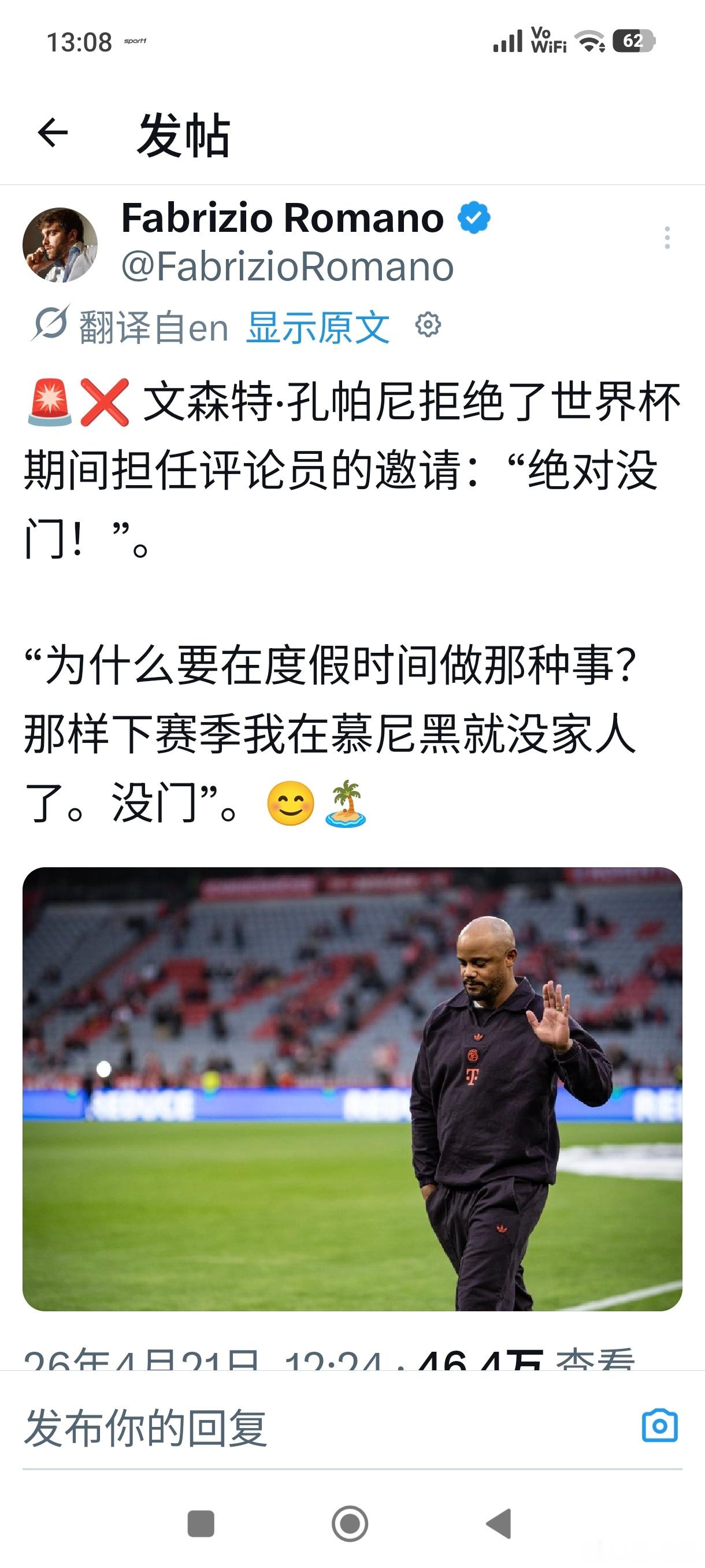 [孔帕尼拒绝了在世界杯期间担任评论员嘉宾的邀请]拜仁