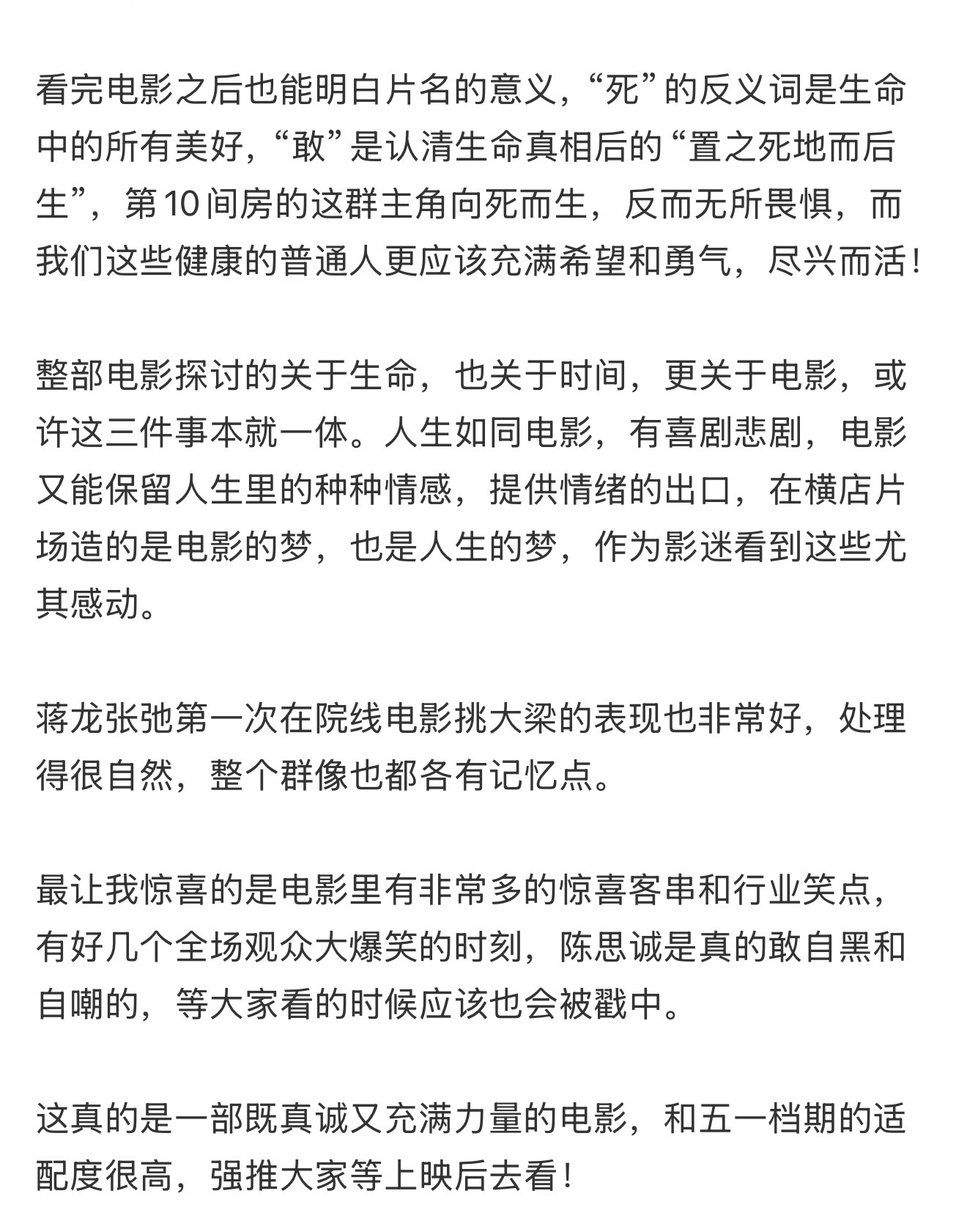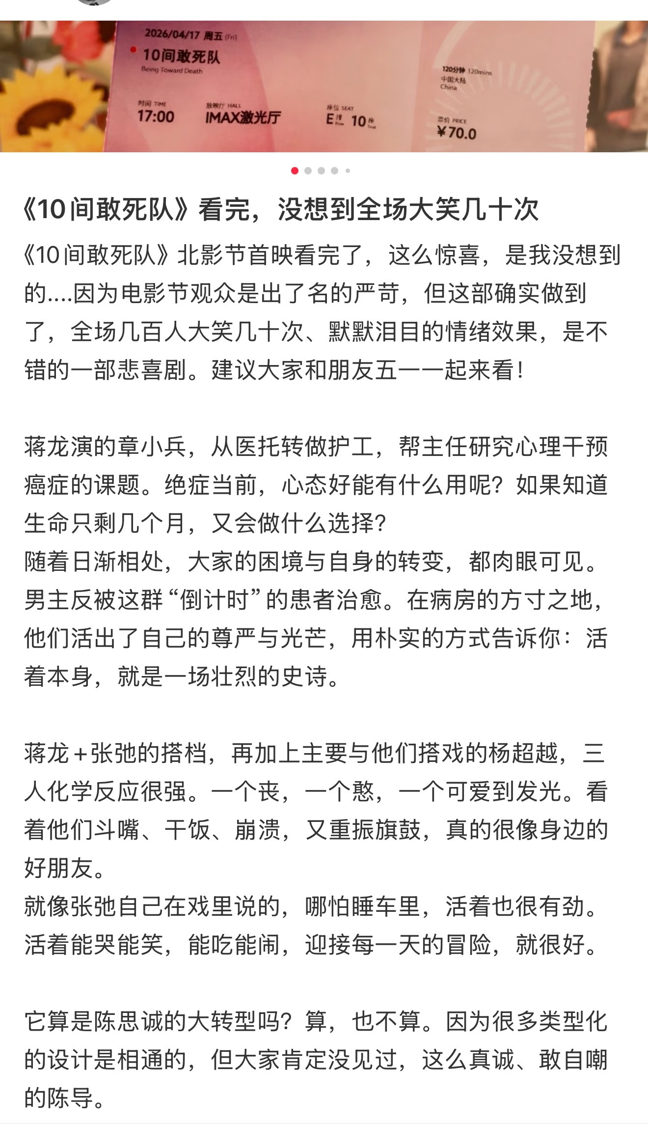 10间敢死队开启点映敢提前大规模点映,咱们小10可以说是底气十足!10间敢死队成为今年五一档电影 中第一部大规模开启提前点映的作品。电影圈向来有个共识:敢提前大规模点映的,才是真不怕检验的好片子。点映面向普通观众,口碑完全自由释放,一旦口碑不稳,在竞争激烈的档期里极易陷入被动。而《10间敢死队》敢做五一档首个提前点映的影片,这份底气和自信,正是来自影片满满的真诚与过硬质量。唯有真心创作,才敢直面所有观众的评价。