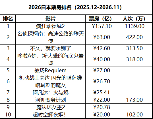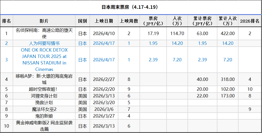 日本周末票房(4.17-4.19):1.《名侦探柯南:高速公路的堕天使》蝉联冠军,累计票房突破63亿;2.《人为何要写情书》在新片中表现最佳;3.《哆啦A梦:新·大雄的海底鬼岩城》累计票房突破40亿。(数据来源:kogyotsushin)