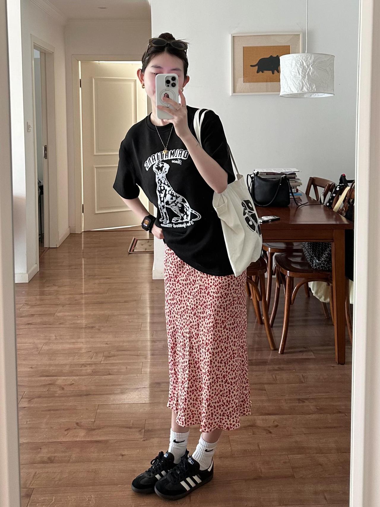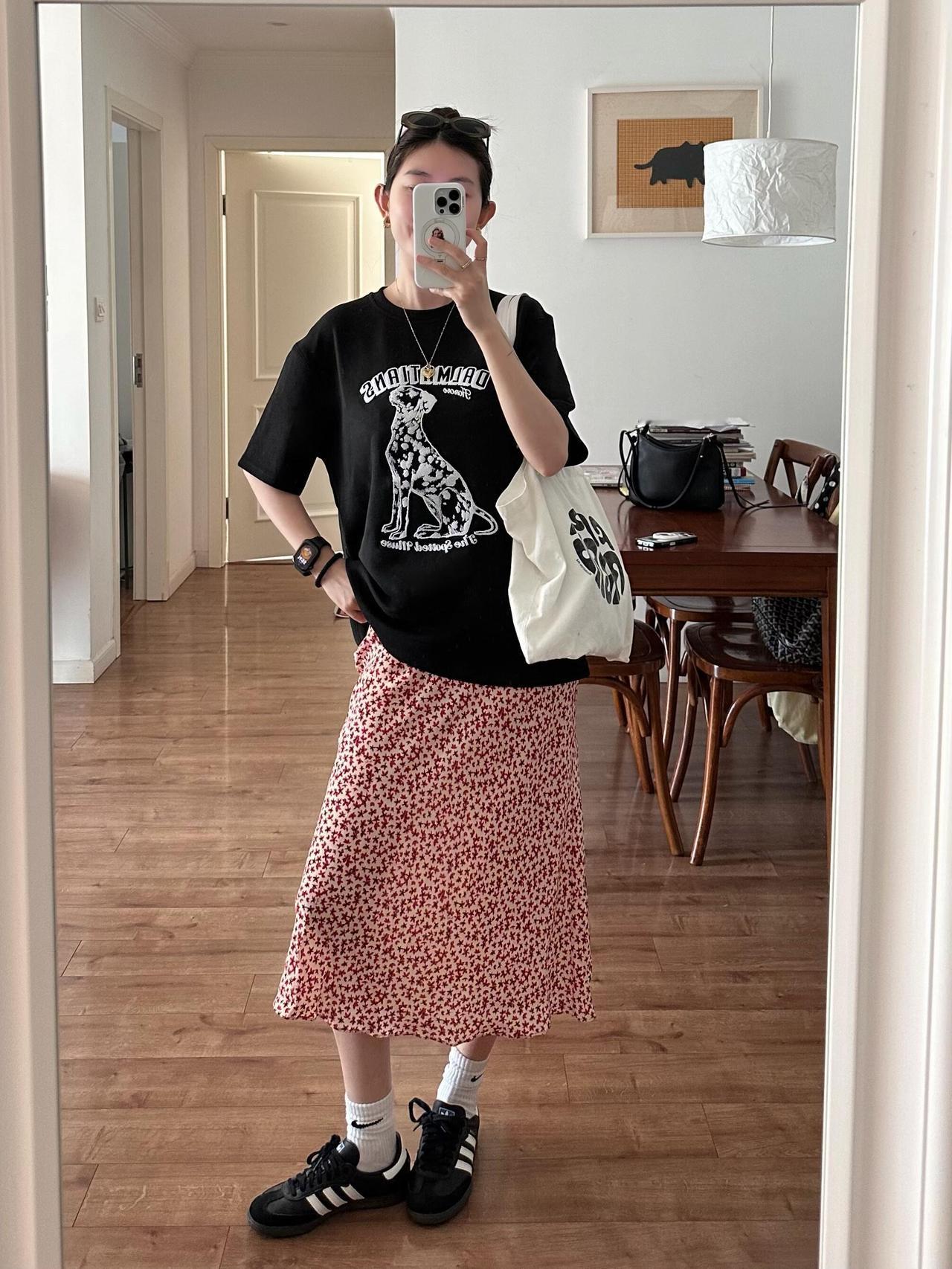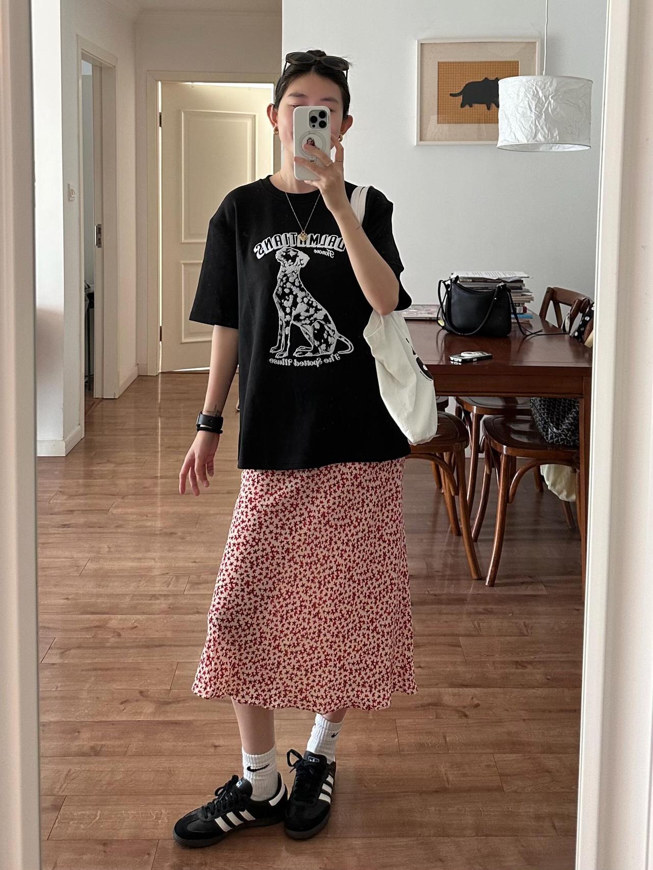 T恤配碎花裙超好看呀! 很喜欢这里的配色!宽松黑T带着斑点狗印花,酷感又俏皮,搭配红白色碎花半裙,把甜酷平衡得刚刚好。脚上的黑德训鞋和白袜,再加上帆布包,整体松弛又有活力,日常出门穿舒服又耐看,完全是不费力的时髦感,清爽又显气质。