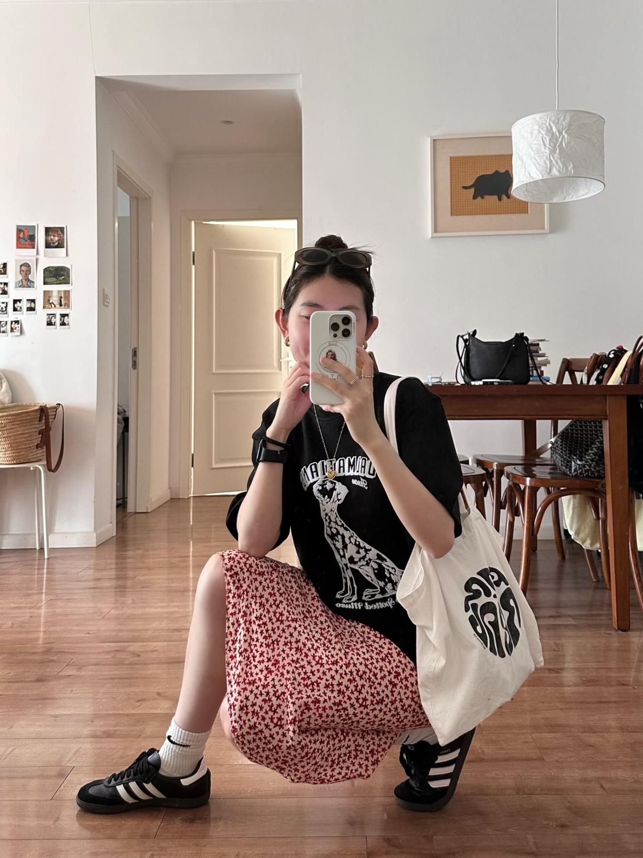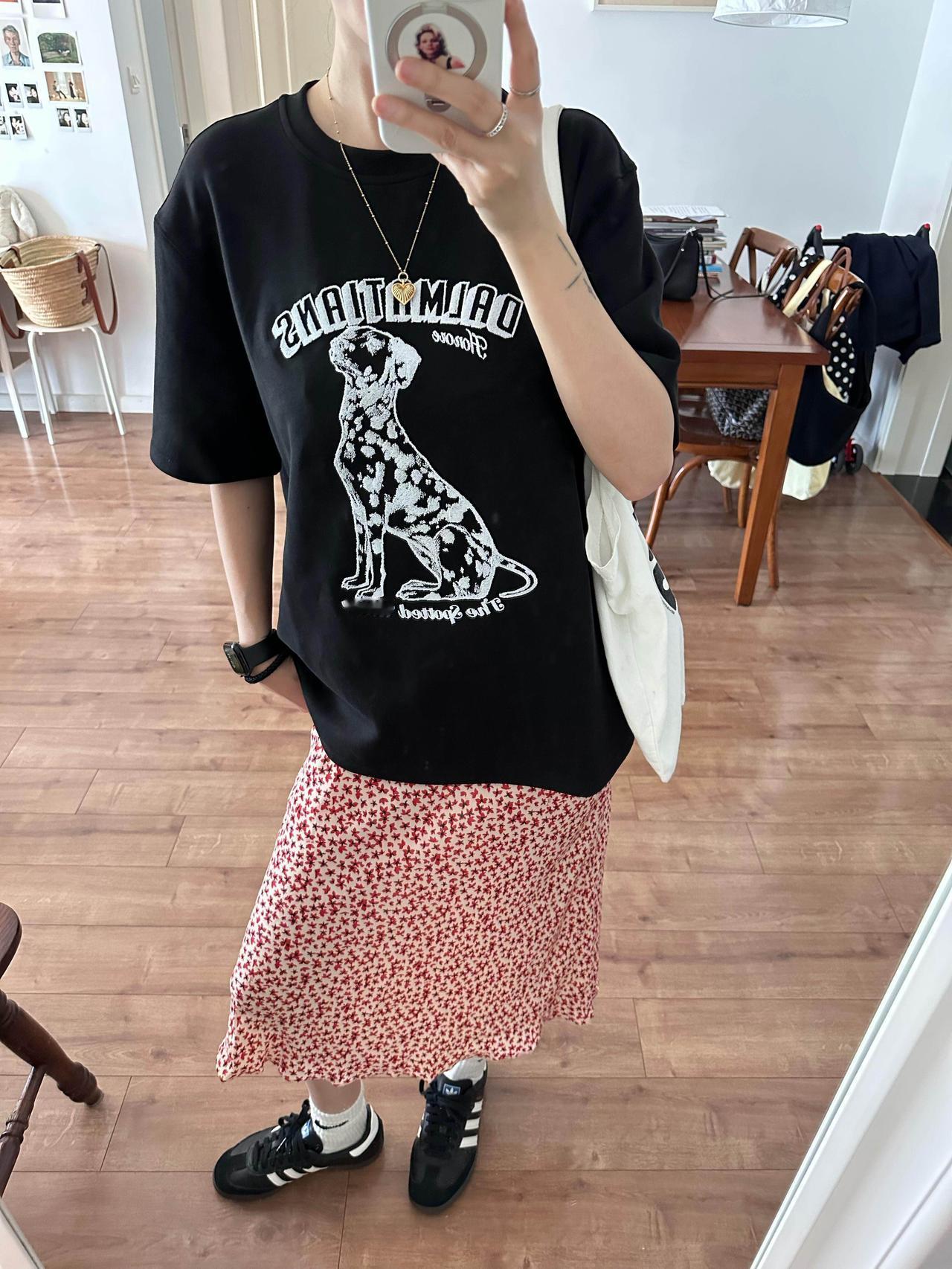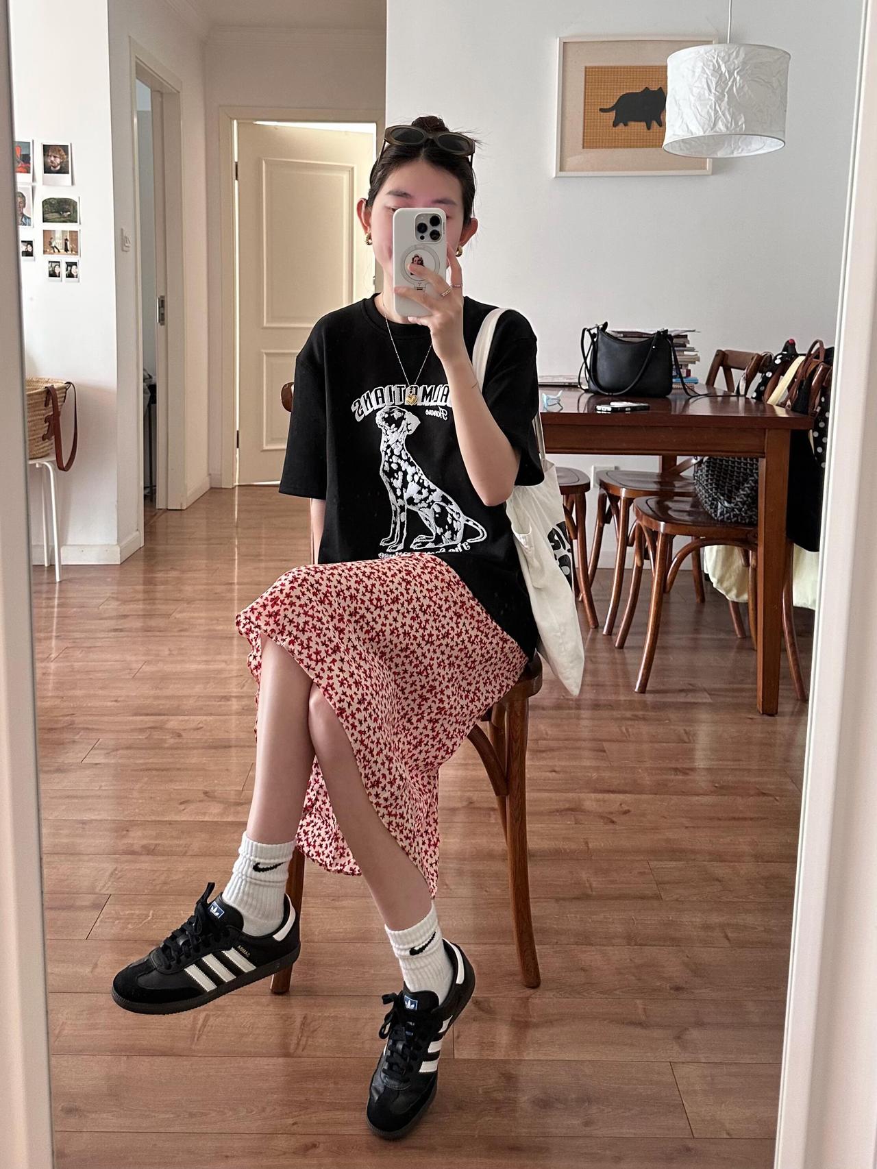 T恤配碎花裙超好看呀! 很喜欢这里的配色!宽松黑T带着斑点狗印花,酷感又俏皮,搭配红白色碎花半裙,把甜酷平衡得刚刚好。脚上的黑德训鞋和白袜,再加上帆布包,整体松弛又有活力,日常出门穿舒服又耐看,完全是不费力的时髦感,清爽又显气质。