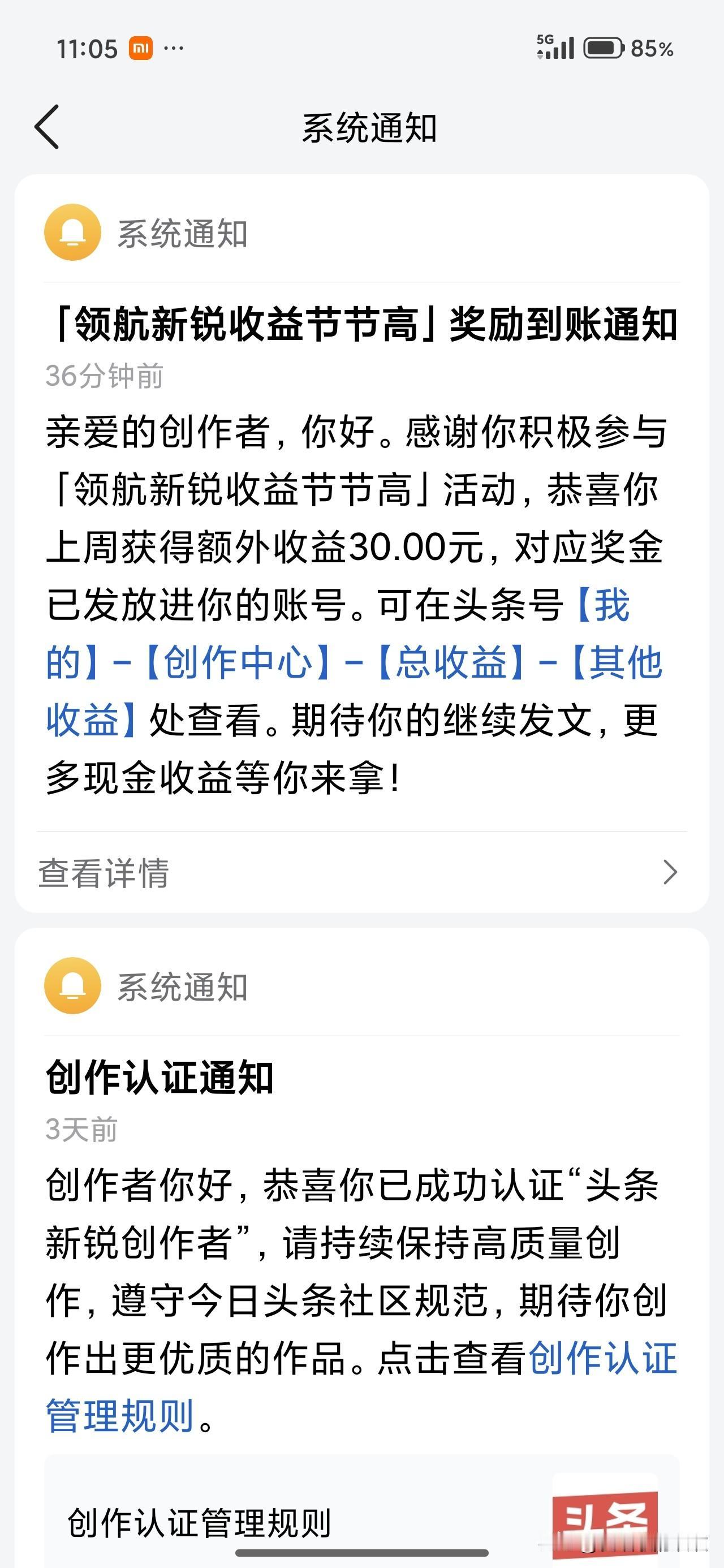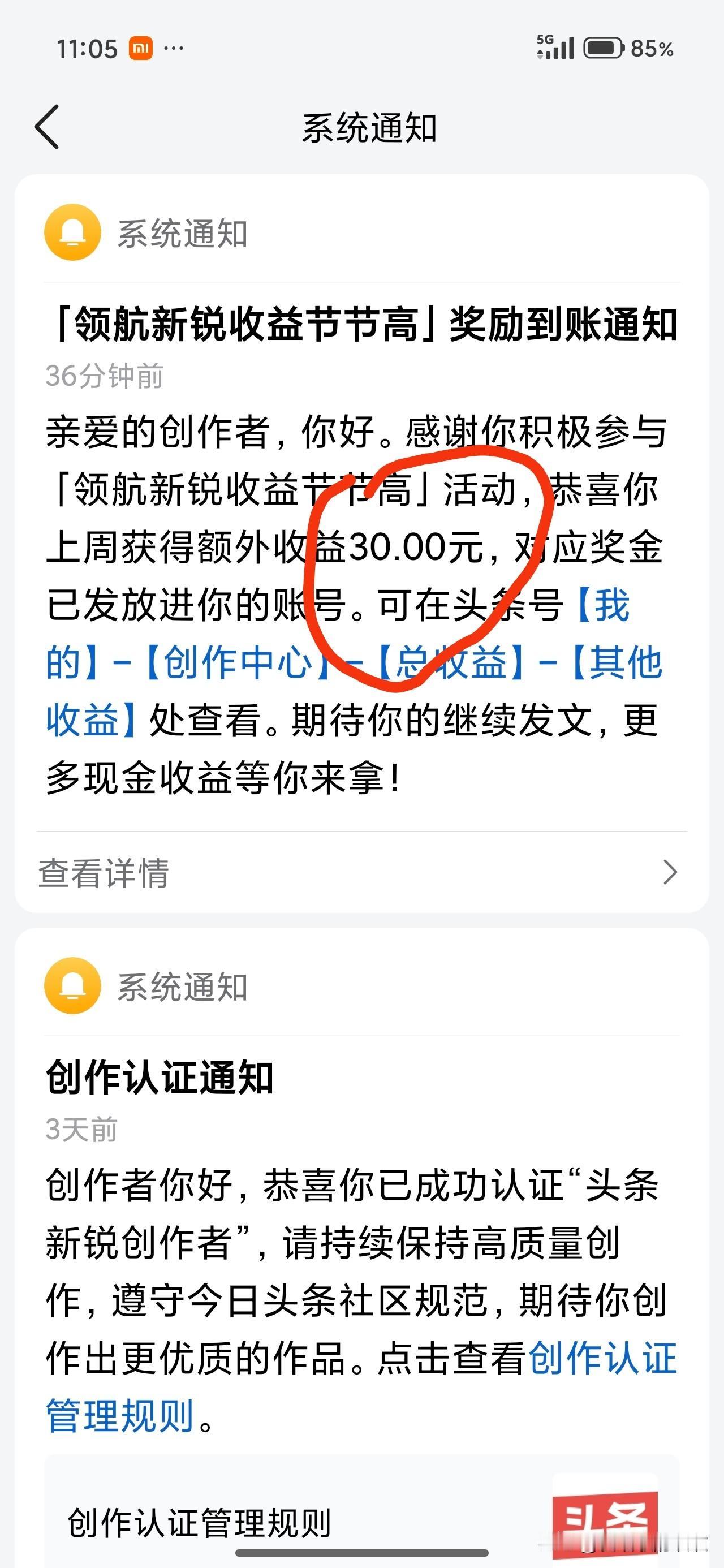 我是乌鲁木齐人,73年属牛的,今年53岁。 今天早上一上班,就收到了系统奖励的额外收益30.00元,让我开心不已。 今天早上10:00多,我去上卫生间的时候,翻看了一下头条。 发现系统36分钟前,给我发了一条通知:“亲爱的创作者,你好!感谢你积极参与《领航新锐收益节节高》活动。恭喜你上周获得额外收益30,00元。对应奖金已发放进你的账号。” 我看到这条信息的第一反应就是:功夫不负有心人,写了这么久,平台终于发现我了。 接着,我赶紧去创作者中心看了一下。没错,的确有30元钱已经进账了。 瞬间,我就激动的不行了。 我赶紧截了个图,微信发给了我姐炫耀,并给她发信息说:“看看,我的坚持努力,平台终于看见了,今天都给我奖励了30元钱呢。以前都是奖励10块8块的,这次奖励了30元钱。好开心啊!” 没想到我姐却说:“比我卖废纸壳强一点。小心你的眼睛吧!你付出的跟你收获的根本就不成正比。不划算,根本不划算。”给我气的。 我说:“那能一样吗?我在乎的是那30元钱吗?分明在乎的是平台带给我的情绪价值和鼓励认可。算了,你还不如个平台。白给你报喜了。” 发完信息我就上班去了。心想,跟这种人说话真没劲。 我今年53岁了。我没想到今天早上我一上班就收到系统奖励的30元额外收益,让我开心不已。那种激动的心情,无以言表。 就像小时候我们上学时被老师表扬一样的激动和开心。不写头条的人是永远都不会懂的。你们大家说我说的对吗? 你们大家收到过这样的额外收益吗?你们收到平台的奖励,会像我一样激动和开心吗?说实话,情绪价值给得满满当当的。真的让我开心了一整天。原来不管人多老,都是需要鼓励和奖励的。你们大家说我说的对吗?欢迎大家在评论区留言。 我是爱唱歌的欢欢,平时喜欢唱歌,但是更爱美食,如果喜欢我就点赞关注我吧!