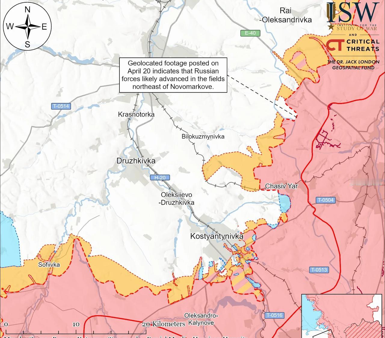 决战双子城之外围争夺:俄军在康城多点渗透,并在东北方向推进 4月20日公开的地理定位视频显示,俄军对康斯坦丁诺夫卡东北部的新马尔诺韦东北地区的乌军阵地发起了攻击与炮击。这说明俄军近期已在该区域实现战术推进,突破了部分乌军前沿阵地 。值得注意的是,尽管俄方宣称已完全控制相关区域,但上述视频同时显示,乌军仍在新马尔诺韦北部及东北部维持阵地存在,与俄军形成对峙,双方对该区域的控制权争夺仍在继续 。 4月15日至17日公开的地理定位视频显示,乌军对南部新德米特里夫卡境内的俄军占领建筑、康斯坦丁诺夫卡东北部的俄军阵地,以及康斯坦丁诺夫卡东部的俄军单兵实施了精准打击。这些行动发生在俄军执行渗透任务之后 。此外,一名俄罗斯军事博主称,俄军已在康斯坦丁诺夫卡南部取得推进,进一步加剧了该方向的紧张局势 。 俄官员公开承认双子城之战进展不如预期。4月20日,俄罗斯国家杜马国防委员会副主席阿列克谢·茹拉夫廖夫指出,顿涅茨克州当前局势属于“阵地对峙”,俄军每周推进仅“数百米”,且攻占斯拉维扬斯克与克拉马托尔斯克可能需要“数月”时间 。 (图文部分参考战争研究所报告)