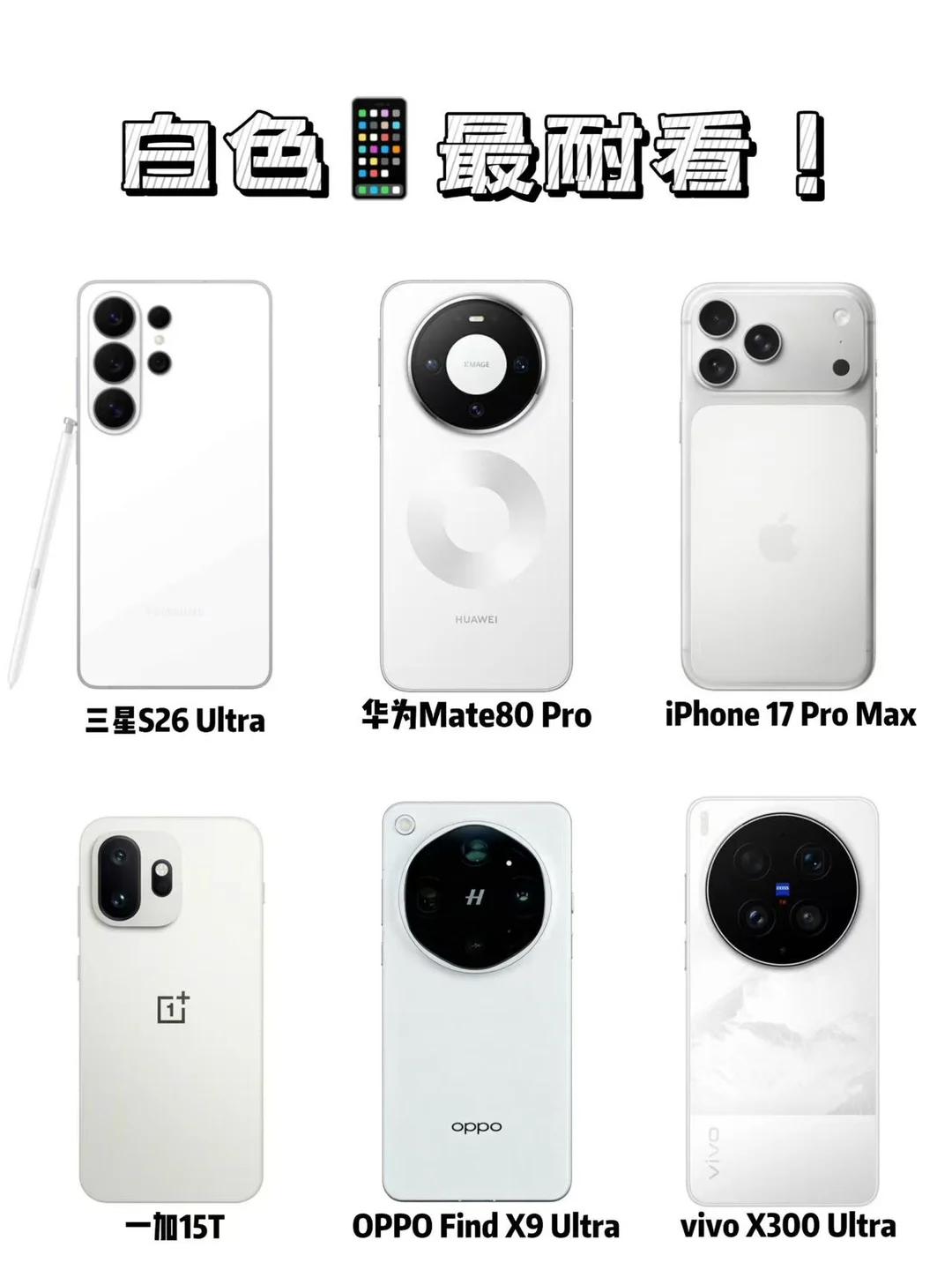 白色手机汇总!苹果和国产手机你喜欢哪个? 近年来各个厂家都在颜色上玩出了不少新花样,不得不承认很多都很漂亮,但是也总有审美疲劳的时候。 在我看来白色是手机上最耐看的颜色了,而且在二手市场,白色也是相对更保值的颜色,上面找了几台近期主流牌子出的白色,个人觉得一加15T的白色更纯粹,三星的很高级,其他几台多少都在后盖上整点花样。各位觉得如何呢? 数码大玩家 iPhone 手机分享 安卓和苹果 国产手机 iPhone17Pro OPPOFindX9Ultra 华为Mate80Pro vivoX300Ultra