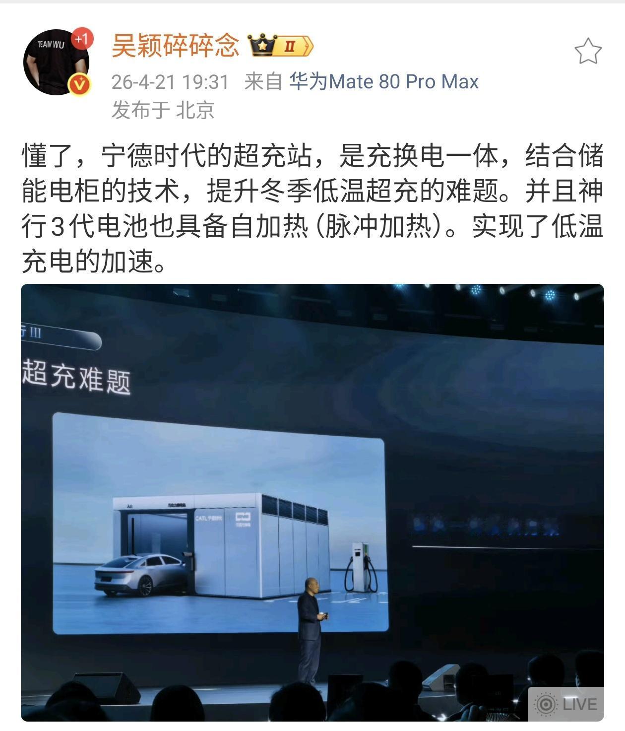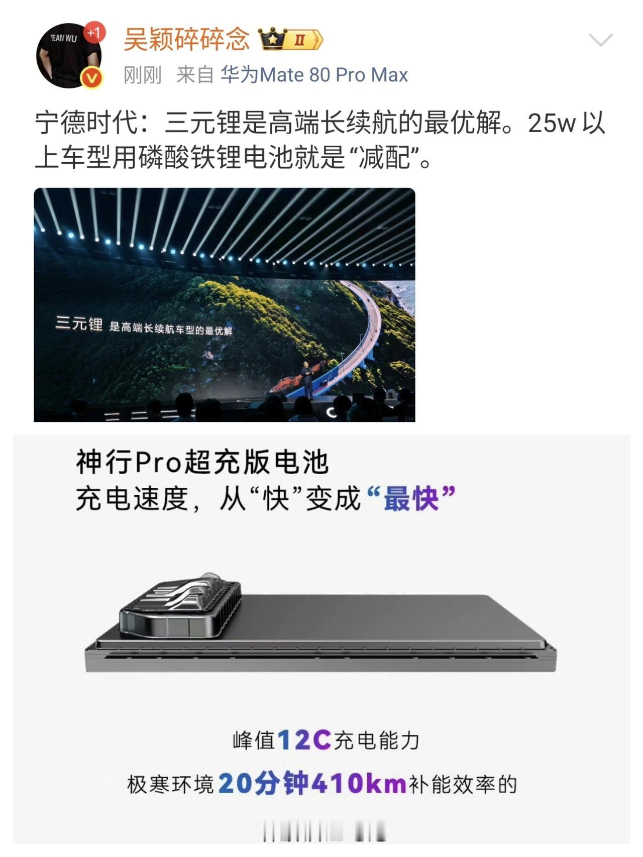 宁德时代发布第三代神行电池,主要解决了低温充电和常温充电的性能。 常温环境下,10%充至35%只需要1分钟;10%充至80%只需要3分44秒;10%充至98%只需要6分27秒。零下30℃极寒环境,20%充至98%只需要9分钟多。这些数值的确超过了隔壁比亚迪闪充和吉利金砖电池,说一句遥遥领先不过分。 但问题来了,现在有没有实车展示?多久能大规模量产呢?我们不能只看PPT,最终用户看的是实测啊。 我记得去年宁德时代的领导说闪充伤电池隔两天就发布峰值12C功率,充电5分钟续航520km的电池。但去年发布的12C电池,至今没看到哪个车型有。 发布会还拉踩磷酸铁锂,说25万以上车型用磷酸铁锂是减配,这一句话得罪多少厂商啊?你发布的超充电池不也是磷酸铁锂?自己把自己打成低端啊? 发布会真的难绷。好好的发布自家产品不好吗?非要搞拉踩。