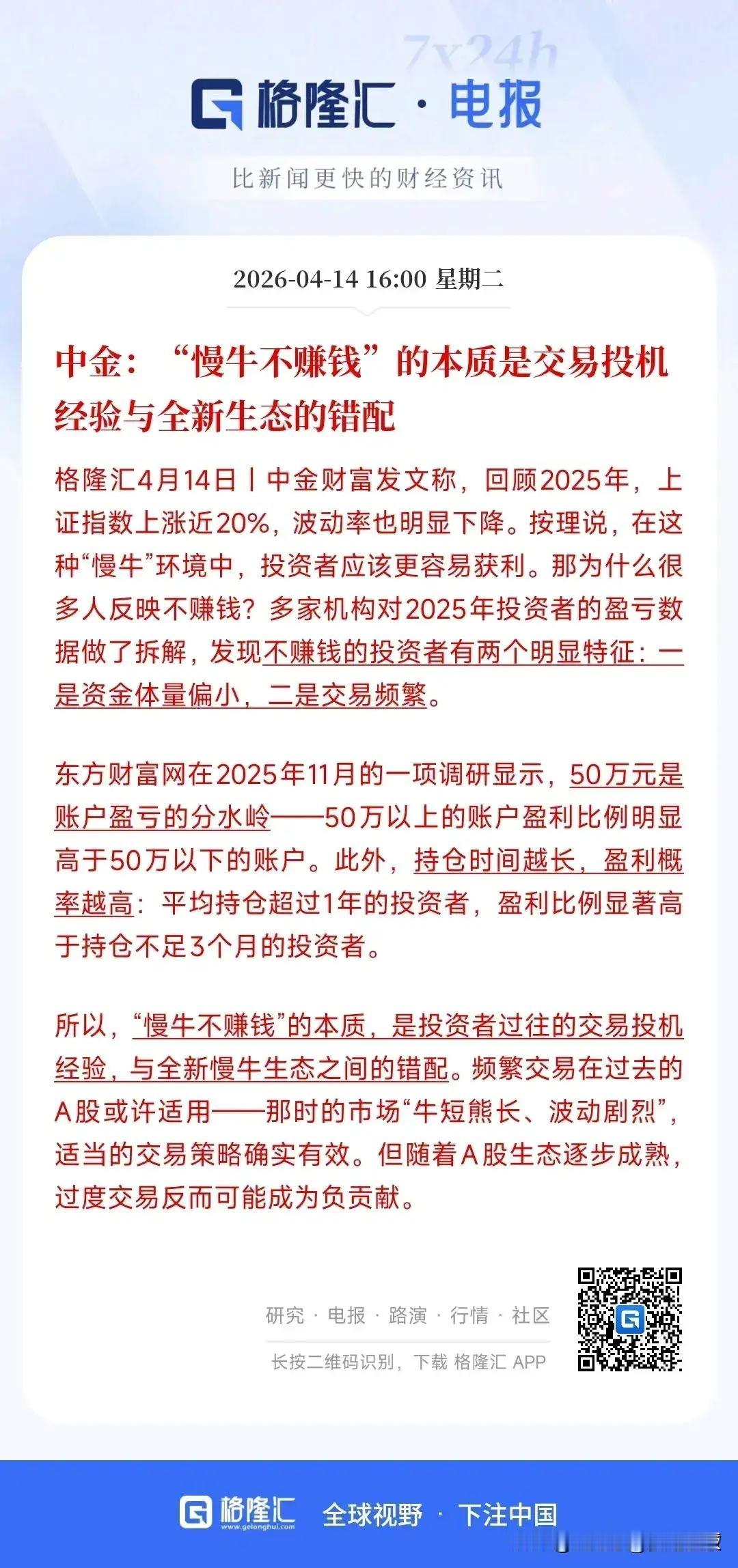 2025年大盘涨了快20%,小区老王却天天唉声叹气,说自己不仅没赚钱,还倒亏了5万。这事儿听着怪,直到看到中金公司那句话才明白——不是市场不行,是咱们老散户那套投机本事,跟现在的慢牛行情根本对不上号了。 老王就是个典型。以前波动大的时候,他一天能买卖三次股票,追着涨停板跑,偶尔还能赚点快钱。今年不一样了,大盘慢慢往上爬,可个股波动小了不少。他还是老套路,看见哪个板块涨了就往里冲,跌了就赶紧割肉,结果手续费交了一堆,手里的票换了一轮又一轮,回头一看,还不如年初不动的人赚得多。 楼下小张就相反。他去年买了两只高股息的银行股,平时几乎不看盘,就按月领分红。今年大盘涨起来,他的票虽然没涨停过,却稳稳涨了15%,加上分红,收益比老王高出一大截。问他咋忍住不动的,他说“以前追热点亏怕了,现在想通了,慢牛里拼的不是手快,是能坐得住”。 这两年市场真的变了。以前那种大起大落的行情少了,慢慢往上走成了常态。这时候还靠频繁交易、追涨杀跌,就像在平路上开赛车,猛打方向盘反而容易翻车。数据也摆在那儿:资金量10万以下的散户,今年平均换手率是大户的5倍,可收益率却低了近10个百分点。操作越勤,亏得越狠,这话一点不假。 小区里另一个张阿姨更有意思。她前年买了只新能源基金,中间跌了20%都没卖,今年慢慢涨回来,还赚了30%。她说自己不懂啥技术分析,就记得理财经理那句话“好公司不怕等”。现在她每天遛弯跳广场舞,压根不操心盘面波动,收益反倒比那些天天盯盘的人强。 慢牛这东西,说穿了就是磨性子。以前靠“快”赚钱,现在得靠“慢”取胜。就像种庄稼,以前是抢收抢种,现在得选好种子,慢慢施肥浇水,急着收割反而颗粒无收。那些天天刷财经新闻、追着热点换股的,就像在麦田里来回跑,没等麦子成熟就割,最后只能捡点麦穗子。 真要在现在的市场里赚钱,得改改老毛病。选标的时多看基本面,别光看K线图;买的时候找低位慢慢买,别看见涨了就往里冲;拿的时候别总想着做波段,除非公司真出了问题,否则少动多看。说到底,慢牛时代最值钱的不是你的操作技巧,是那份“任他风吹草动,我自岿然不动”的耐心。 老王最近也学乖了。他清了手里那些乱七八糟的票,选了两只业绩稳定的消费股,设了个闹钟,每周只看一次盘。前两天碰到他,说虽然没赚大钱,但账户总算开始泛红了。他说现在才明白,市场慢下来的时候,人也得慢下来,跟得上节奏才能分到红利。 其实投资这事儿,跟过日子挺像。以前总想着一夜暴富,靠投机走捷径,现在才发现,稳稳当当往前走,反而能走得更远。慢牛里不缺机会,缺的是能守住纪律、耐住性子的人。与其天天盯着屏幕找机会,不如选对方向沉住气,时间到了,收益自然会来。