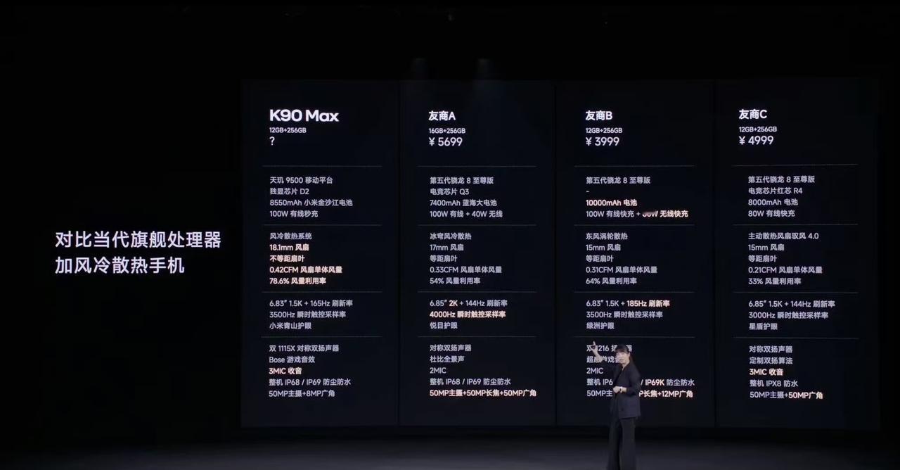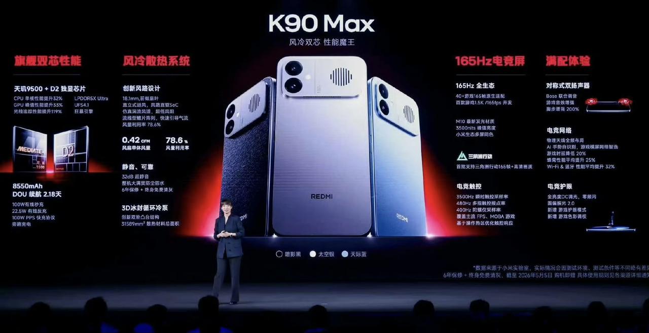 全体起立!这里是雷军广场,红米果然是性价比守门员,内存涨又如何?自主散热风扇、天玑9500+独显芯+165Hz+8550mAh+光影猎人影像,国补2549上车!简单总结发布会价格/配置 红米K90Pro Max 12GB+256—— 2999元 16GB+256—— 3499元 12GB+512—— 3499元 16GB+512—— 3999元 16GB+1TB —— 4699元 ● 核心: ▫️天玑9500+独显芯D2 ▫️LPDDR5X+UFS 4.1 ▫️6.83”1.5K 165Hz LPTS直屏 ▫️8550mAh电池+100W有线 ▫️散热材料总面积31509m㎡ ▫️小米手机首款风冷主动散热方案 屏幕: ▫️华星M10发光技术体系|极窄边设计 ▫️峰值亮度3500nits ▫️小米青山护眼3.0|圆偏振光2.0 ▫️全亮度DC调光|支持1nit ▫️480Hz多指触控|3500Hz瞬时采样 风扇: ▫️18.1mm尺寸|直立式进风设计 ▫️独立密封风道|0.42CFM/min ▫️仿真涡流风道|金属轴承系统 ▫️三挡转速模式|风噪低至32dB ▫️6年保修+终身免费清洁 (5月5日前购机) 影像: ▫️主摄|50MP 光影猎人800 1.55" F/1.68 ▫️超广|8MP 1/4" F/2.2 ▫️前置|20MP 支持1080P 60fps 其它: ▫️红外遥控|NFC|双频GPS ▫️兼容100W PPS|22.5W有线反充 ▫️两颗小米澎湃T1+丨7根竞技天线 ▫️1115X 对称双扬+Bose联合调音 ▫️金属中框+玻纤背板|3麦克风 ▫️整机支持IP66/68/69防尘防水 游戏: ▫️支持全游戏 165fps 插帧 ▫️原生超40款游戏 165fps模式 ▫️热区触控优化、游戏护眼模式 ▫️400Hz 六轴陀螺仪 说实话,雷军拿出这套,诚意已经拉满了,要知道上一个这么堆料的耀子win,骁龙8Elite,起步价是2699,而天玑9500>8Elite是没疑问的。 另外屏幕方面,K90 Max同样舍得堆料,基本上啥好用啥了,圆偏振光2.0、M10的发光材料、480Hz多指触控,甚至是上了165Hz?摊牌了呗,就是为了电竞赛道产的 那压力来到iQOO和一加了[捂脸],因为红米K90 Max不止做了风冷主动散热+防水,还有扬声器也顶上去了,主打游戏性能,但外围配置也不差啊 我只能说雷总还是太能说服高管了[狗头],这套配置,目前定价2999就有点离谱吧?大家说呢?
