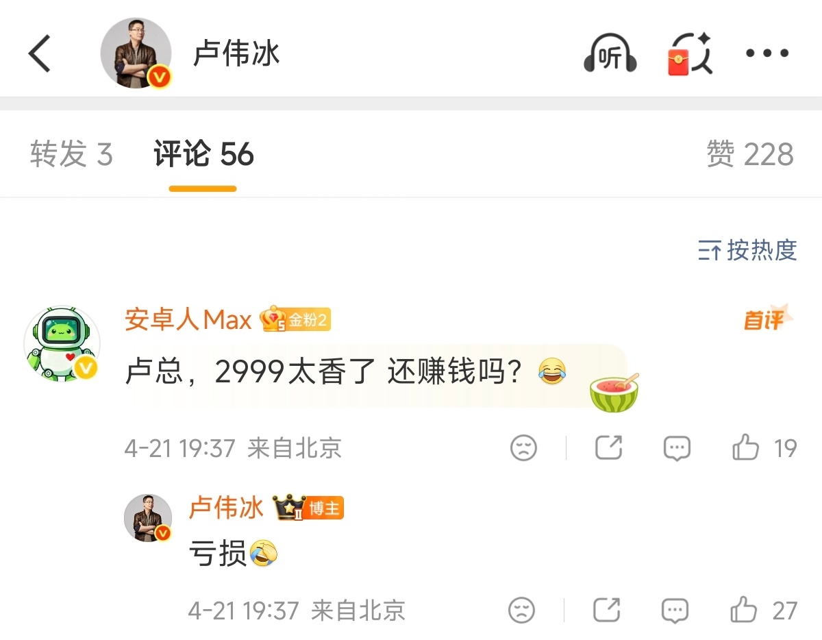 REDMI K90 Max有着正代旗舰芯,加上目前行业最强的内置风扇,首销价格仅有2999元起,这是官方内存补贴加电商补贴才能完成的超低价。就连卢总都在评论区回复“亏损”。卢伟冰回应K90Max定价亏损