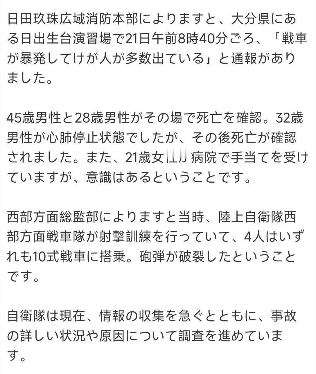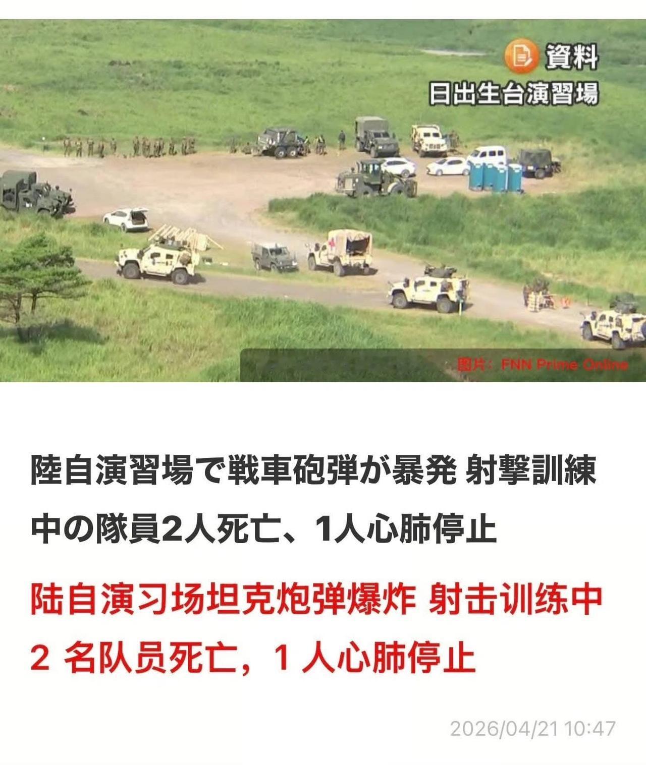 日本坦克训练场自爆现场。4月21日上午,日本陆自射击训练,一辆10式坦克车上弹药爆炸,炸死3人。 据称是弹药在炮管内走火爆炸,当场炸死2人,1人重伤不治。乘员全灭、碎了一地。