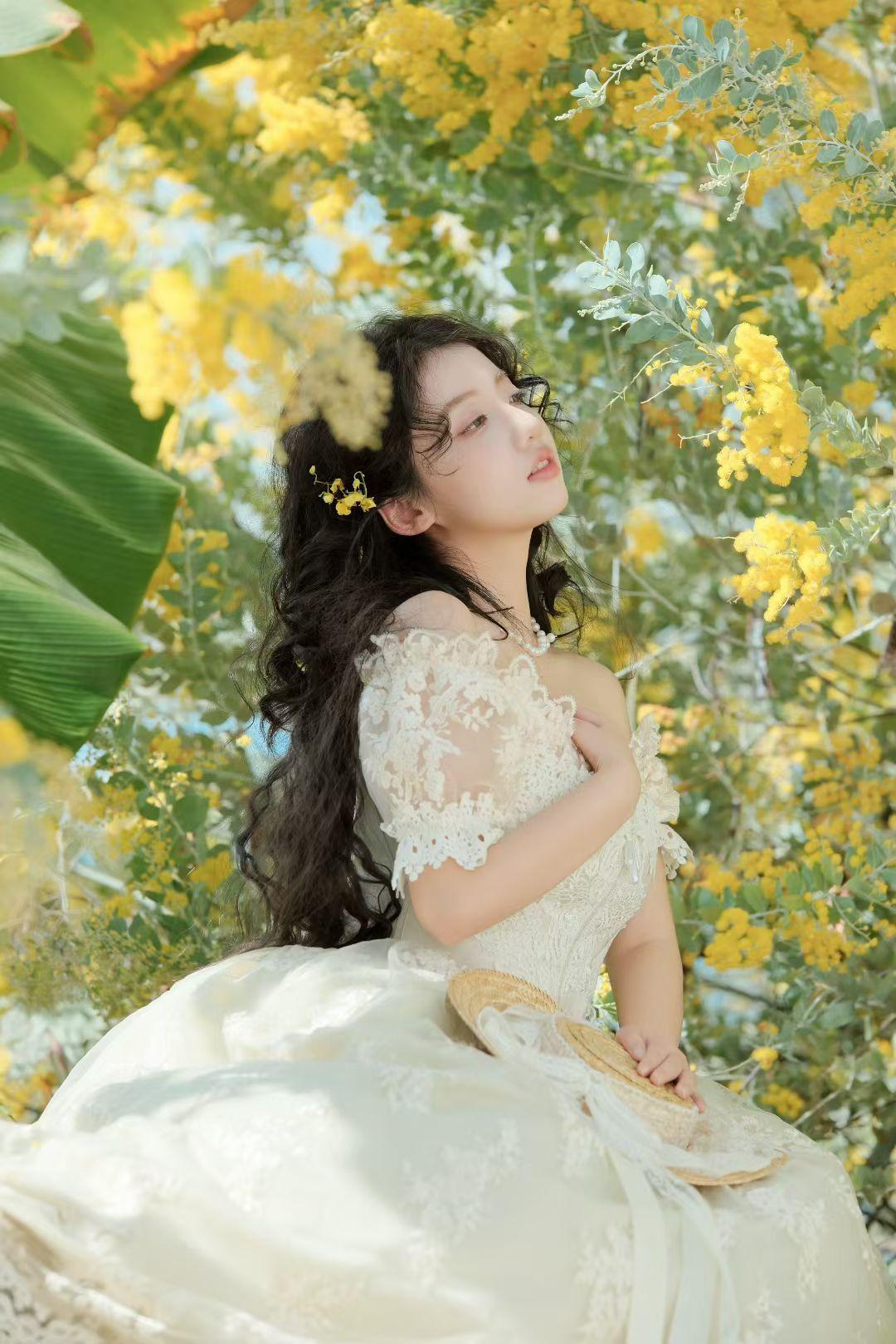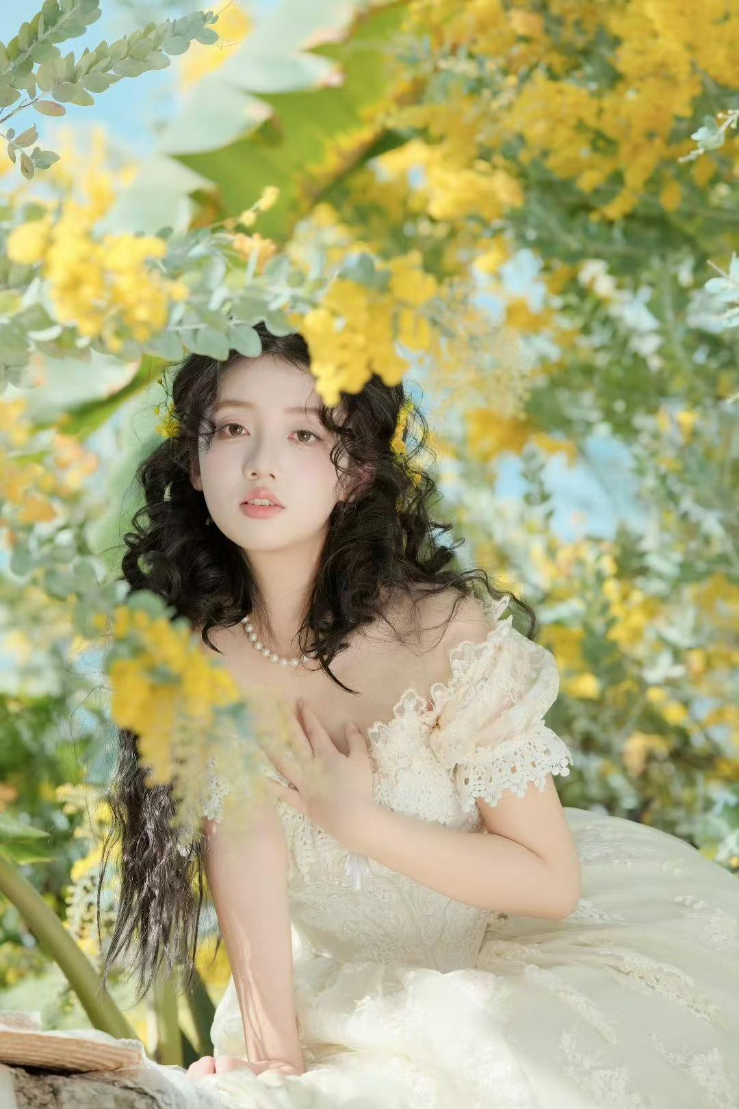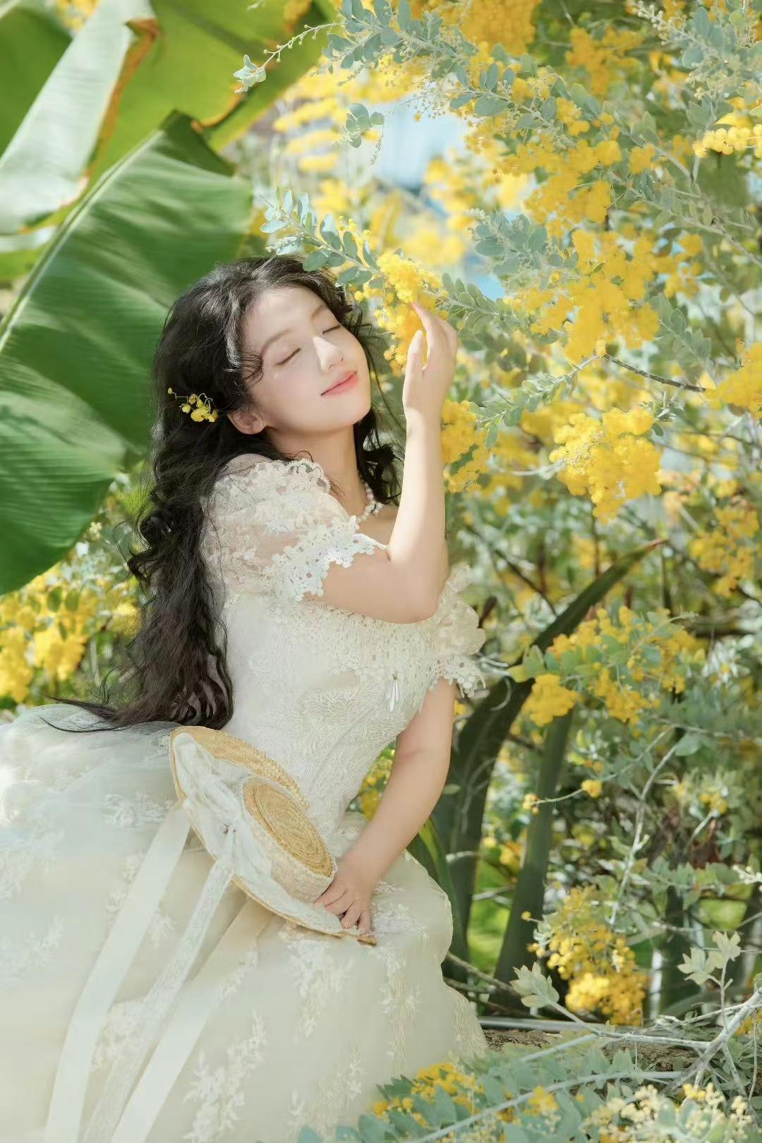 金合欢开得漫山遍野,阳光穿过枝叶,落在蕾丝裙上,像一场不真实的春日童话。 风里带着花香,少女的裙摆和卷发都浸在温柔里,这一刻,春天与浪漫撞了个满怀。