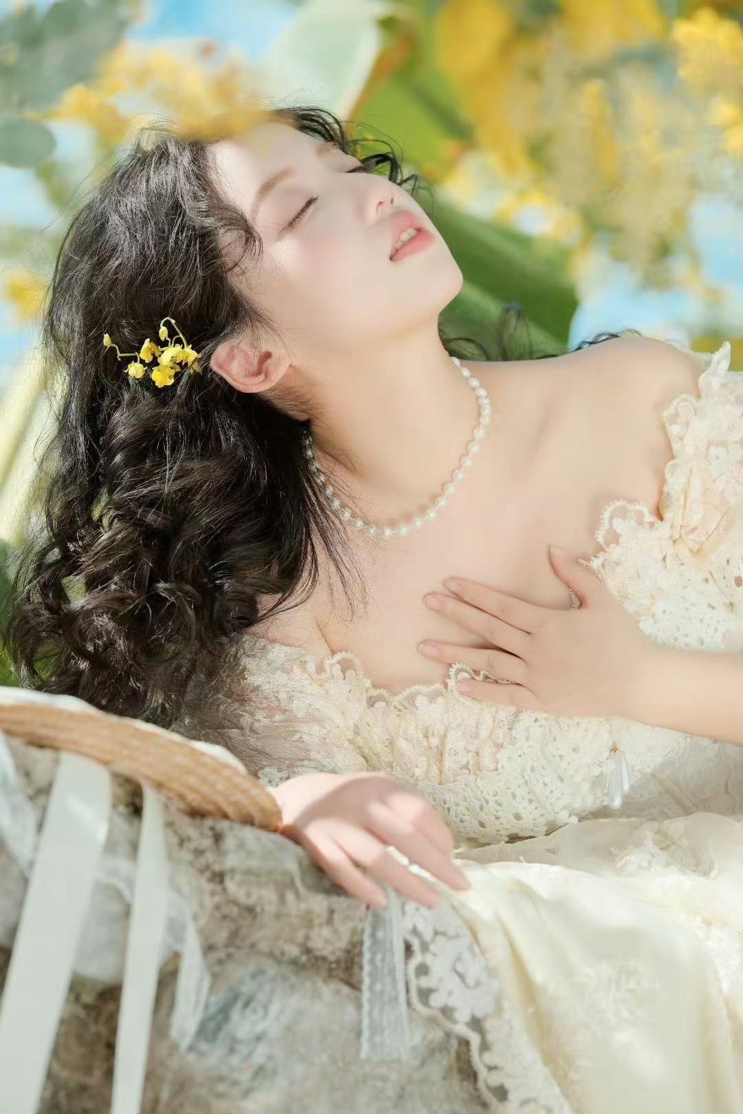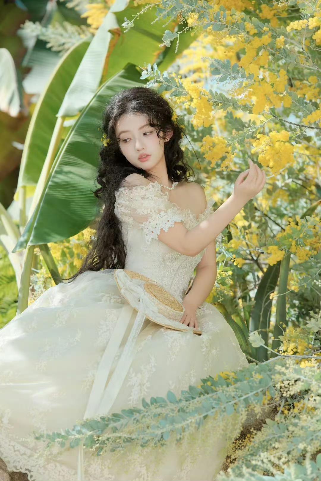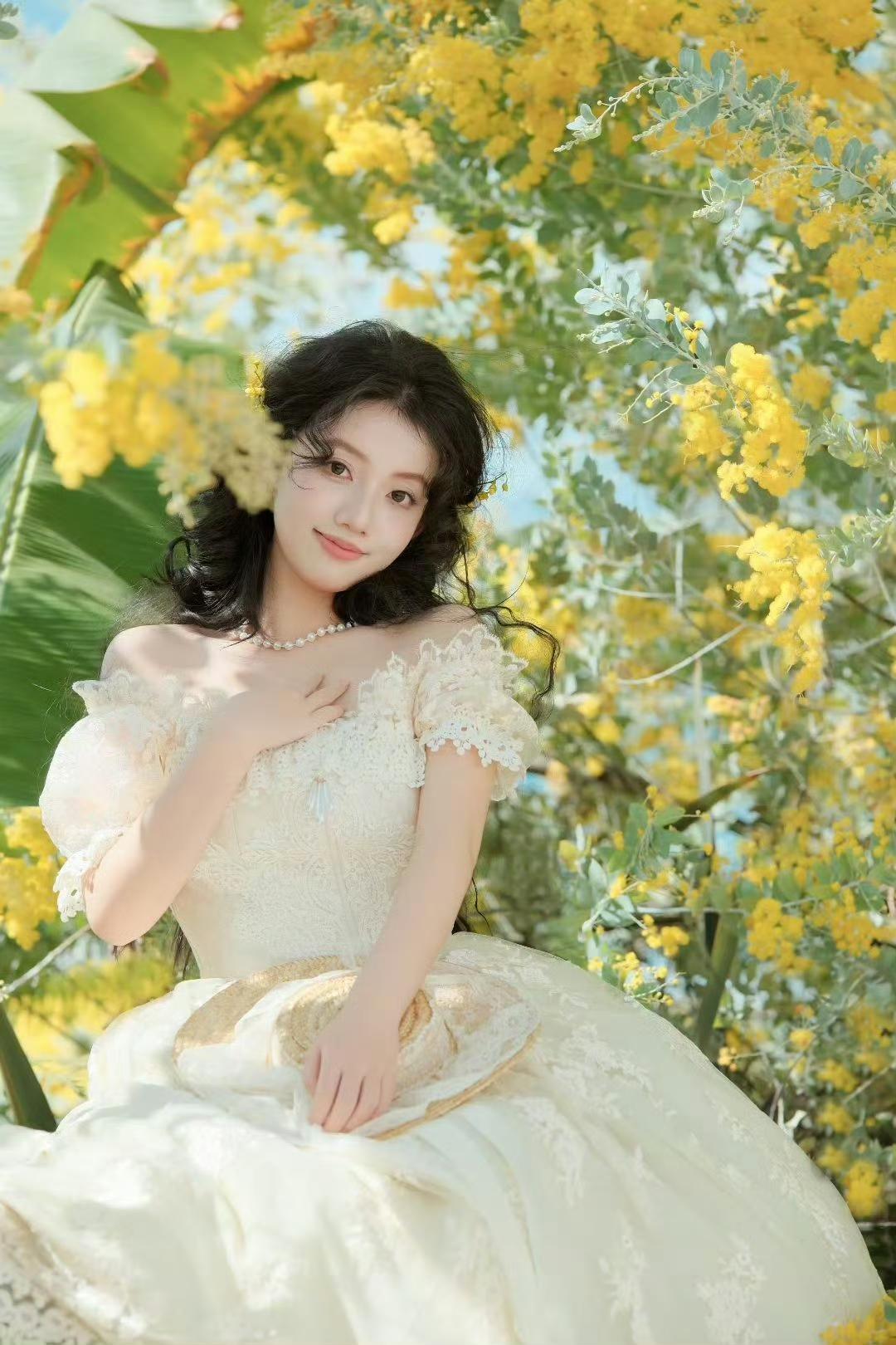 金合欢开得漫山遍野,阳光穿过枝叶,落在蕾丝裙上,像一场不真实的春日童话。 风里带着花香,少女的裙摆和卷发都浸在温柔里,这一刻,春天与浪漫撞了个满怀。