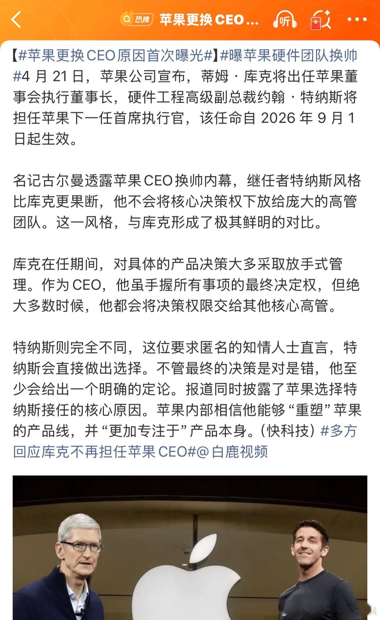 苹果更换CEO原因首次曝光 正常操作吧,库克年龄也大了!换个更有精力的年轻人!