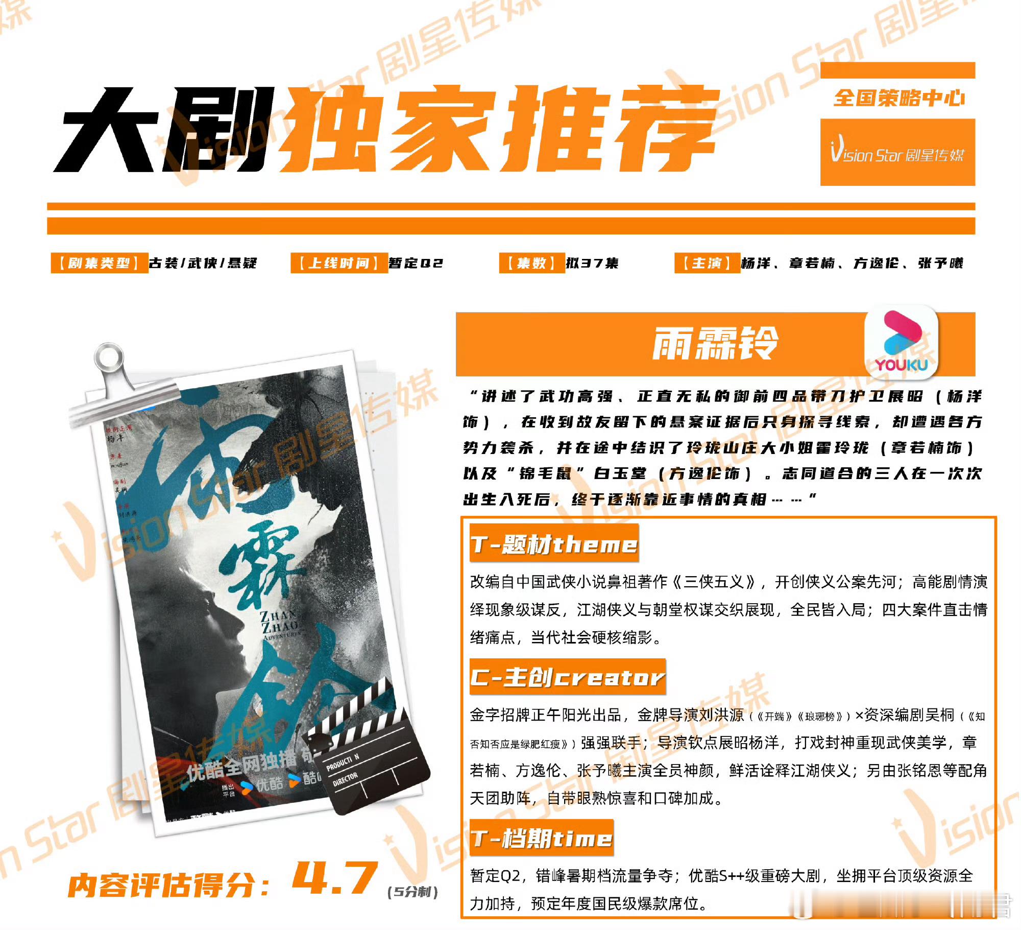杨洋、章若楠、方逸伦《雨霖铃》预计5月下旬优酷开播。【题材】改编自中国武侠小说鼻祖著作《三侠五义》【主创】金字招牌正午阳光出品,金牌导演刘洪源(《开端》《琅琊榜》)×资深编剧吴桐(《知否知否应是绿肥红瘦》)强强联手;导演钦点展昭杨洋,打戏封神重现武侠美学,章若楠、方逸伦、张予曦主演全员神颜,鲜活诠释江湖侠义;另由张铭恩等配角天团助阵,自带眼熟惊喜和口碑加成。优酷S++级重磅大剧,坐拥平台顶级资源全力加持,预定年度国民级爆款席位。