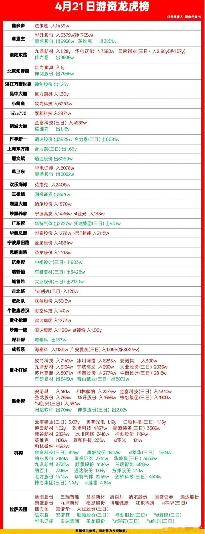 4月21日游资动向:成都系净买9214万,温州帮卖出2.01亿一、核心结论1. 资金全面高低切换:前期高位热门股集中被砸盘离场,游资主攻低位补涨标的,汽车零部件、算力液冷、新能源材料成为主要进攻方向。2. 多空分歧明显:英维克出现游资多空对垒,一方买入一方卖出,短线情绪博弈加剧。3. 商业航天主线退潮:神剑股份遭大额抛售,高位资金撤离信号明确,板块热度快速降温。4. 题材分散轮动:算力、汽车、液冷、半导体均有资金布局,无绝对统一主线,以低位试错、超短套利为主。二、顶级游资核心操作1、成都系- 买入广安爱众8024万:布局低位电力+算力概念,标的位置低、抛压小,博弈算电一体化题材补涨机会。- 买入海泰科1190万:小仓位试错汽车零部件赛道,跟随板块反弹做短线套利。2、小鳄鱼- 买入致尚科技6754万:聚焦光模块、AI算力相关题材,看中标的创业板高弹性,主打短线热点接力。3、桑田路- 买入圣龙股份4884万:狙击汽车零部件人气标的,借助个股辨识度与换手活跃度,博弈反弹与连板溢价。4、科比- 买入泰和科技2871万:布局新能源材料方向,叠加水处理业务,低位低吸博弈赛道轮动机会。5、欢乐海岸买入英维克2406万:逆势低吸液冷算力标的,博弈个股分歧后的修复反弹行情。6、思明南路- 买入圣龙股份1708万:与桑田路形成合力,跟风做多汽车零部件龙头,强化个股短线情绪。7、炒股养家- 买入宁波高发1436万:布局低位汽车零部件标的,看重业绩稳健与低位安全边际,做防守型短线配置。8、湖里大道- 买入纳尔股份1571万:小仓位试错氢能源、燃料电池相关低位题材,博弈赛道补涨。9、章盟主- 买入华升股份3380万:布局低位液冷、算力转型标的,低位吸筹博弈题材发酵。- 卖出英维克3252万:高位获利了结或分歧离场,与欢乐海岸形成多空对垒,落袋为安。10、广东帮- 卖出华特气体2728万:半导体气体题材高位兑现,短期涨幅较大后撤离避险。11、瑞鹤仙- 卖出有研复材3427万:商业航天、散热题材高位止盈,规避高位回调风险。12、屠文斌- 卖出通达股份6060万:特高压、军工相关标的高位抛售,前期涨幅兑现后清仓离场。13、温州帮- 买入金富科技4340万:主攻低位液冷算力补涨标的,小盘易拉升,做超短热点套利。- 买入和林微纳2274万:布局半导体测试探针赛道,小仓位试错国产替代题材。- 卖出神剑股份2.019亿:商业航天高位核心标的大额砸盘,彻底撤离高位题材,完成高低切换。