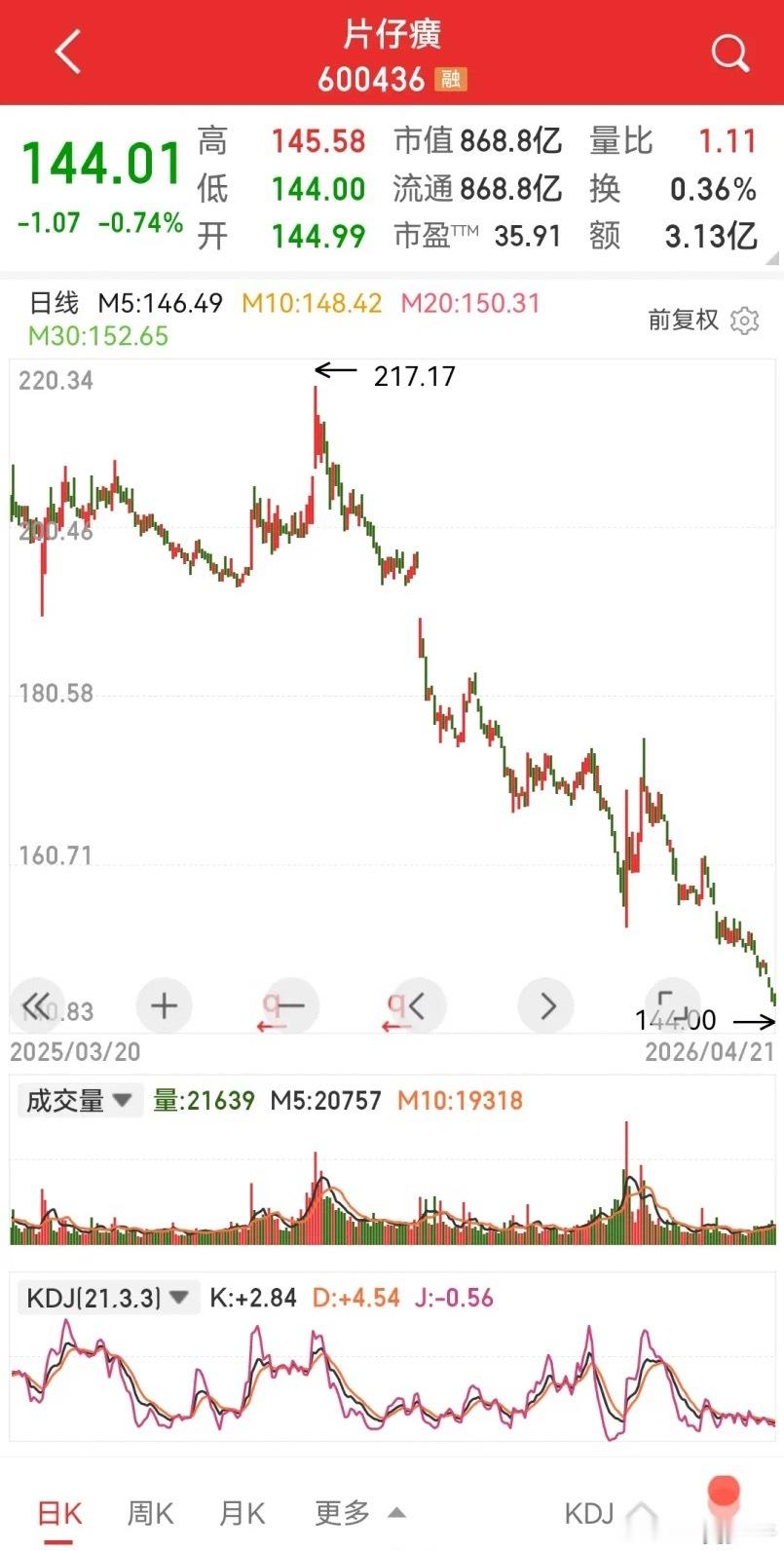 片仔癀,跌跌不休又创新低144元,今年跌幅达14%,何时才是个头。