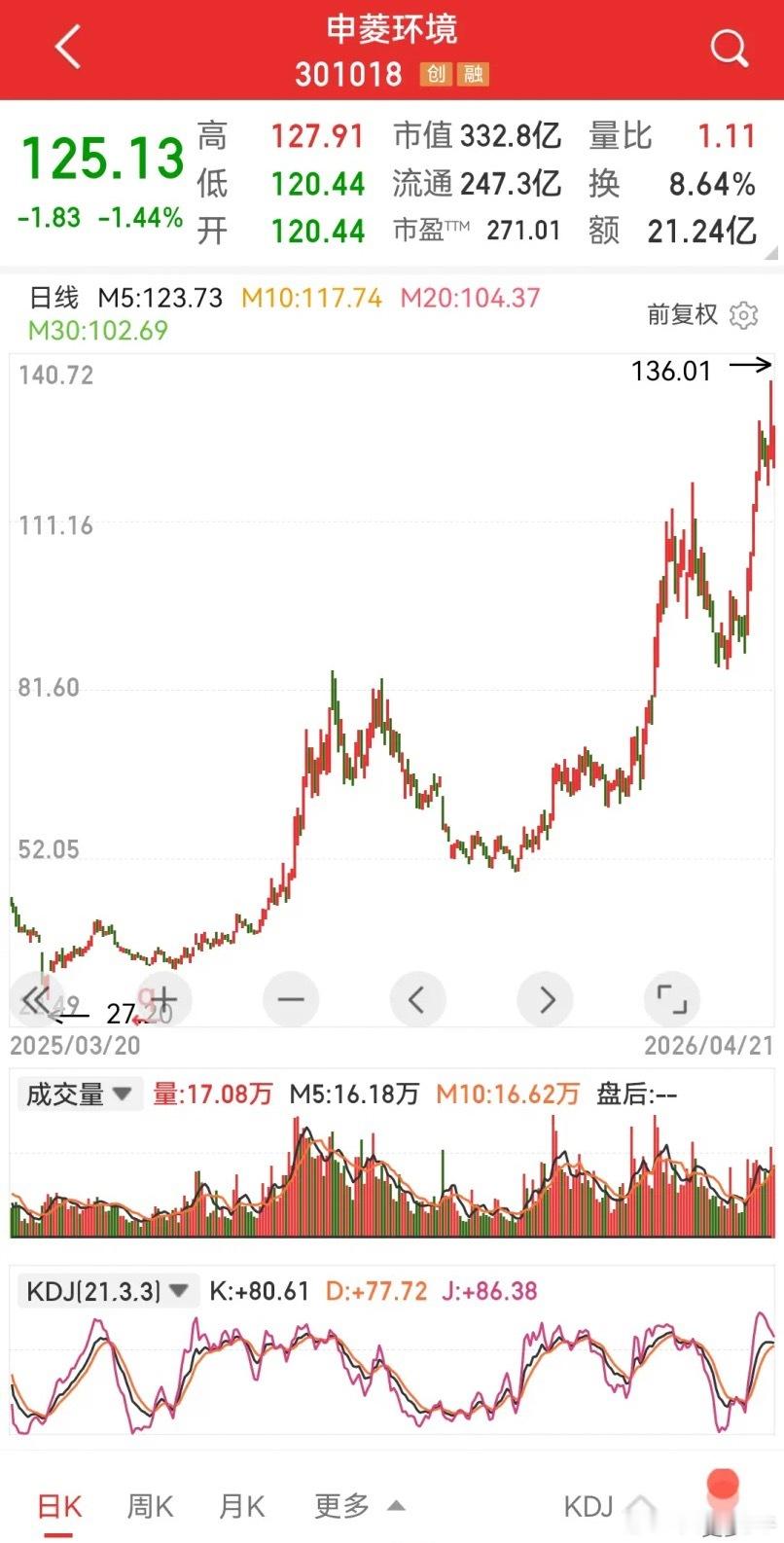 看看总利润仅其十分之一、每股收益仅其五分之一(预估)的申菱环境,股价创出136元的高点。